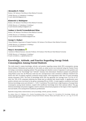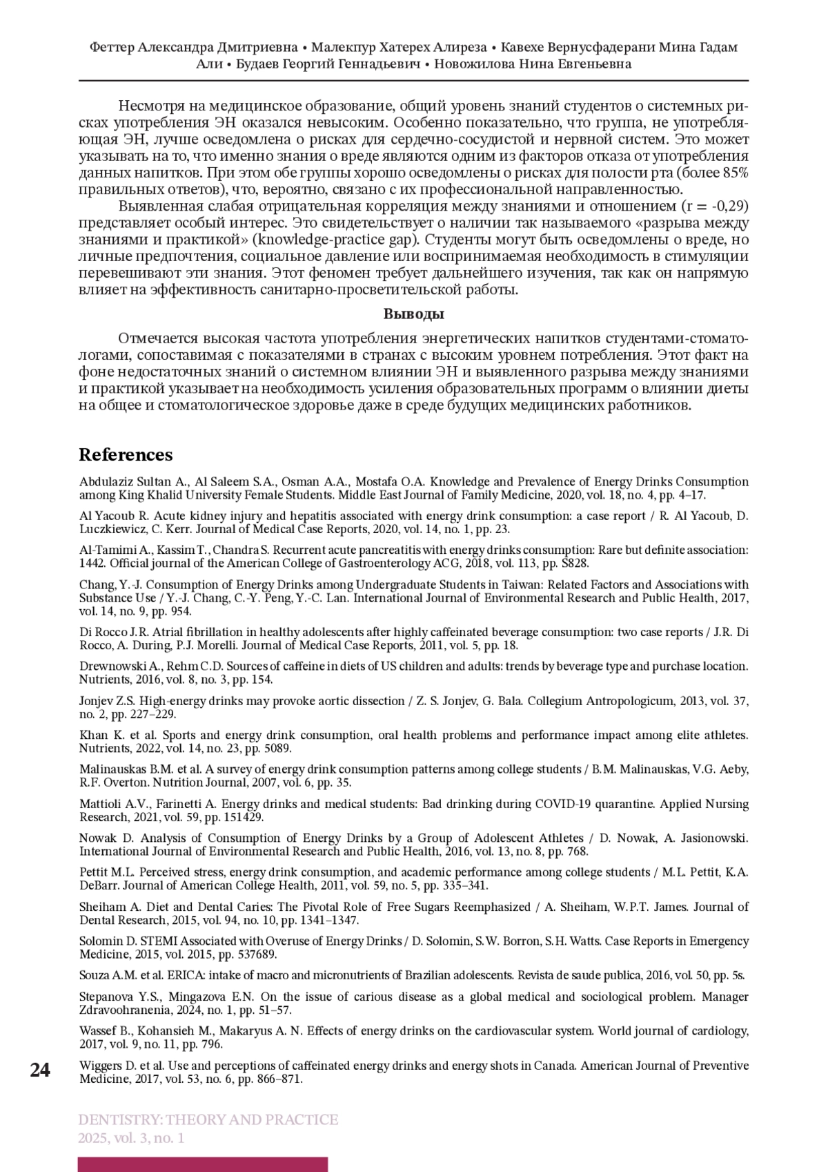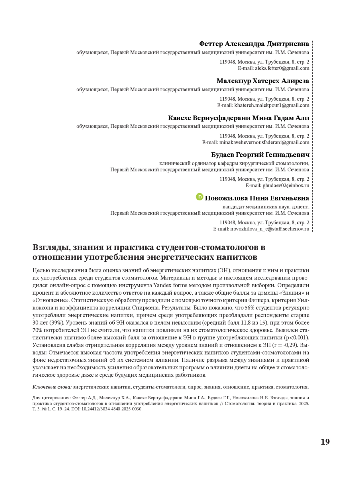 ФЕТТЕР А. Д., МАЛЕКПУР Х. А., КАВЕХЕ В. М., БУДАЕВ Г. Г., НОВОЖИЛОВА Н. Е. ВЗГЛЯДЫ, ЗНАНИЯ И ПРАКТИКА СТУДЕНТОВ-СТОМАТОЛОГОВ В ОТНОШЕНИИ УПОТРЕБЛЕНИЯ ЭНЕРГЕТИЧЕСКИХ НАПИТКОВ // СТОМАТОЛОГИЯ: ТЕОРИЯ И ПРАКТИКА. 2025. № 1, ТОМ 3