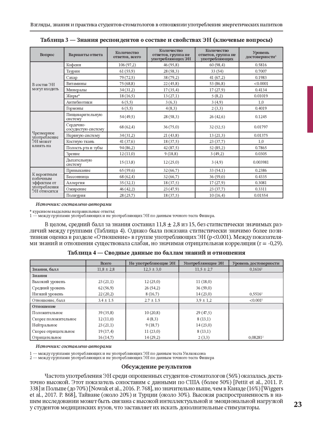 Статья: Взгляды, знания и практика студентов-стоматологов в отношении употребления энергетических напитков (2025)