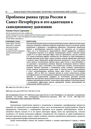 Изучение проблем рынка труда в условиях санкций представляет собой актуальную задачу, поскольку изменения в экономике неизбежно затрагивают занятость населения, уровень безработицы и требования к квалификации работников. Санкционные ограничения привели к трансформации множества отраслей, что отразилось как на кадровом спросе, так и на возможностях трудоустройства. Многие предприятия столкнулись с сокращением персонала из-за разрыва международных связей и снижения объема заказов. В то же время некоторые сферы, такие как производство, сельское хозяйство и IT, начали испытывать дефицит специалистов. Это повлекло за собой необходимость быстрой адаптации рынка труда к новым условиям, включая переобучение работников и развитие новых направлений профессиональной деятельности. В этой связи целью статьи является систематизация проблем рынка труда России и Санкт-Петербурга и его адаптации к санкционному давлению. Задачами исследования являются: выявить проблемы рынка труда, сложившиеся под воздействием санкций; систематизировать успешные практики адаптации к сложившимся новым условиям; спрогнозировать тренды развития регионального рынка труда. В качестве результатов исследования в статье систематизированы проблемы рынка труда России и Санкт-Петербурга в период с 2022 по 2024 год с анализом причин; на основе статистических данных классифицированы и систематизированы направления адаптации рынка к санкционному давлению от государственной поддержки до естественных рыночных реакций; определены долгосрочные тренды развития рынка труда и угрозы, формирующиеся под влиянием адаптационной политики. Анализ рынка труда проведен в отраслевом разрезе, с исследованием эффективных практик предприятий, успешно реализованных для нейтрализации проблем занятости.