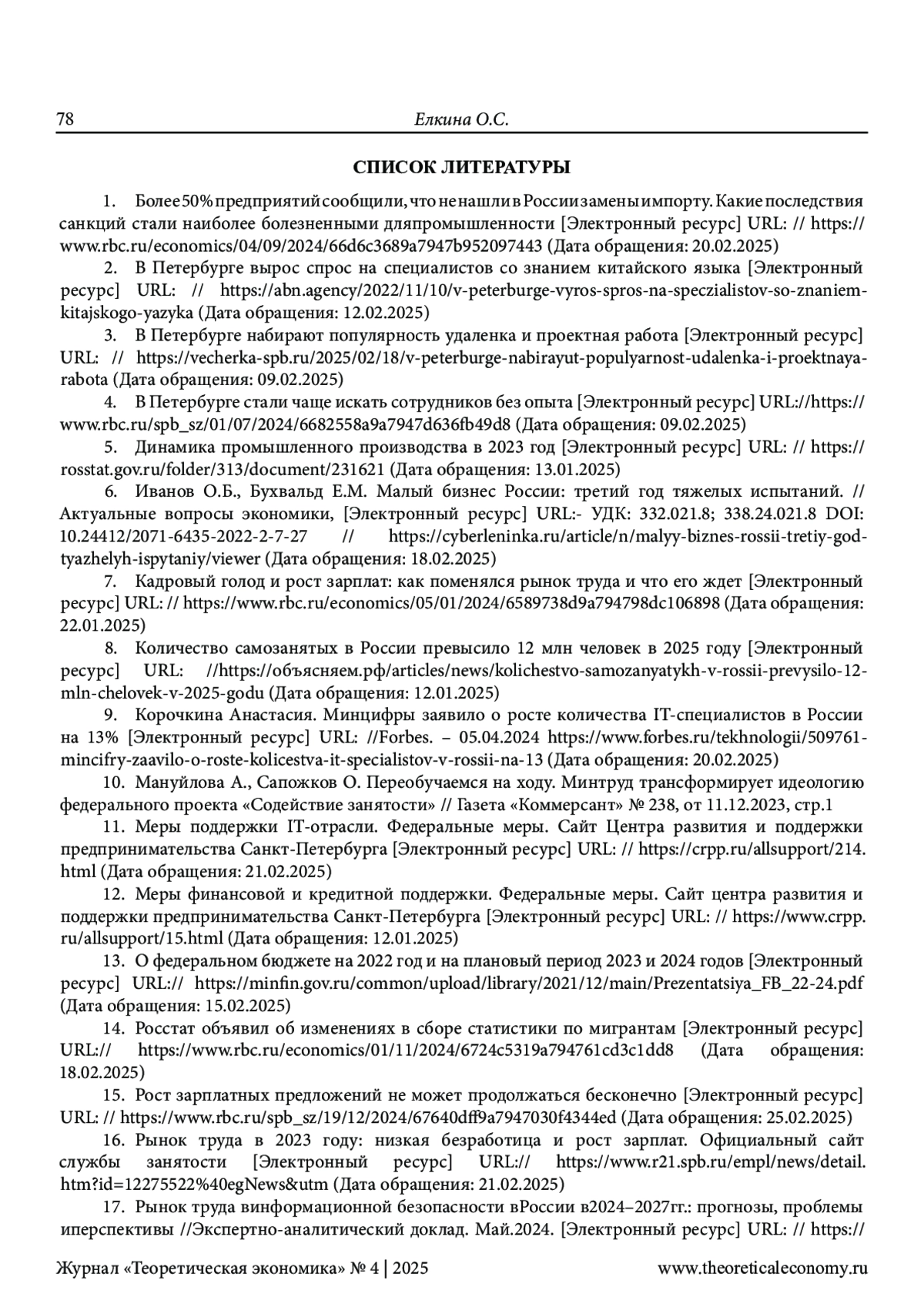 7. Кадровый голод и рост зарплат: как поменялся рынок труда и что его ждет [Электронный ресурс] URL: // https://www.rbc.ru/economics/05/01/2024/6589738d9a794798dc106898 (Дата обращения: 22.01.2025).