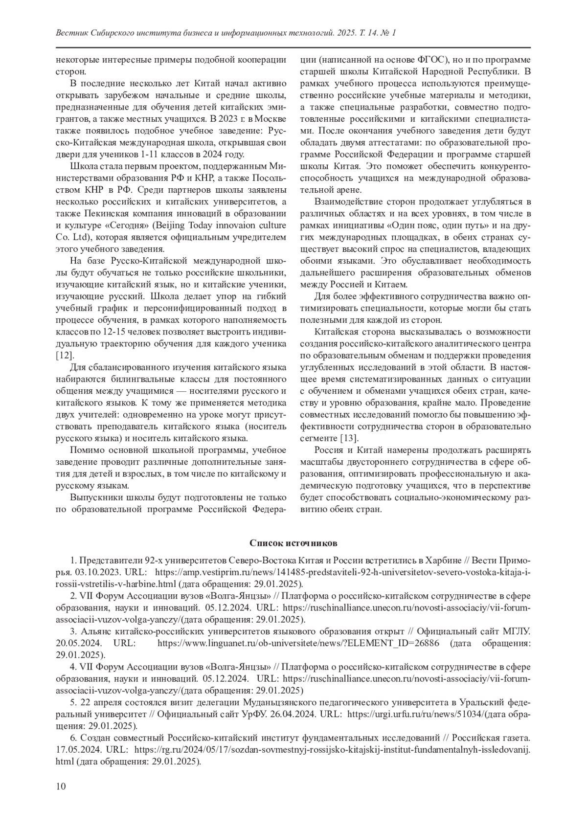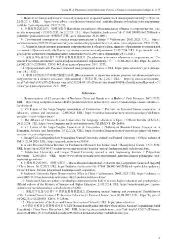10. Россия и Китай активно развивают сотрудничество в области науки, высшего образования и молодежной политики // Официальный сайт Министерства науки и высшего образования. 23.05.2034. URL: https://minobrnauki.gov.ru/press-center/news/mezhdunarodnoe-sotrudnichestvo/83209 (дата обращения: 29.01.2025).
