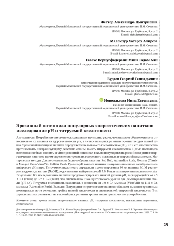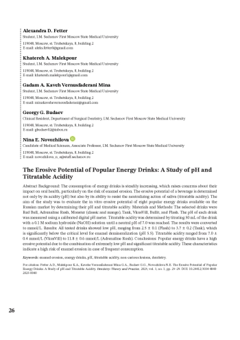 ФЕТТЕР А. Д., МАЛЕКПУР Х. А., КАВЕХЕ В. М., БУДАЕВ Г. Г., НОВОЖИЛОВА Н. Е. ЭРОЗИВНЫЙ ПОТЕНЦИАЛ ПОПУЛЯРНЫХ ЭНЕРГЕТИЧЕСКИХ НАПИТКОВ: ИССЛЕДОВАНИЕ PH И ТИТРУЕМОЙ КИСЛОТНОСТИ // СТОМАТОЛОГИЯ: ТЕОРИЯ И ПРАКТИКА. 2025. № 1, ТОМ 3