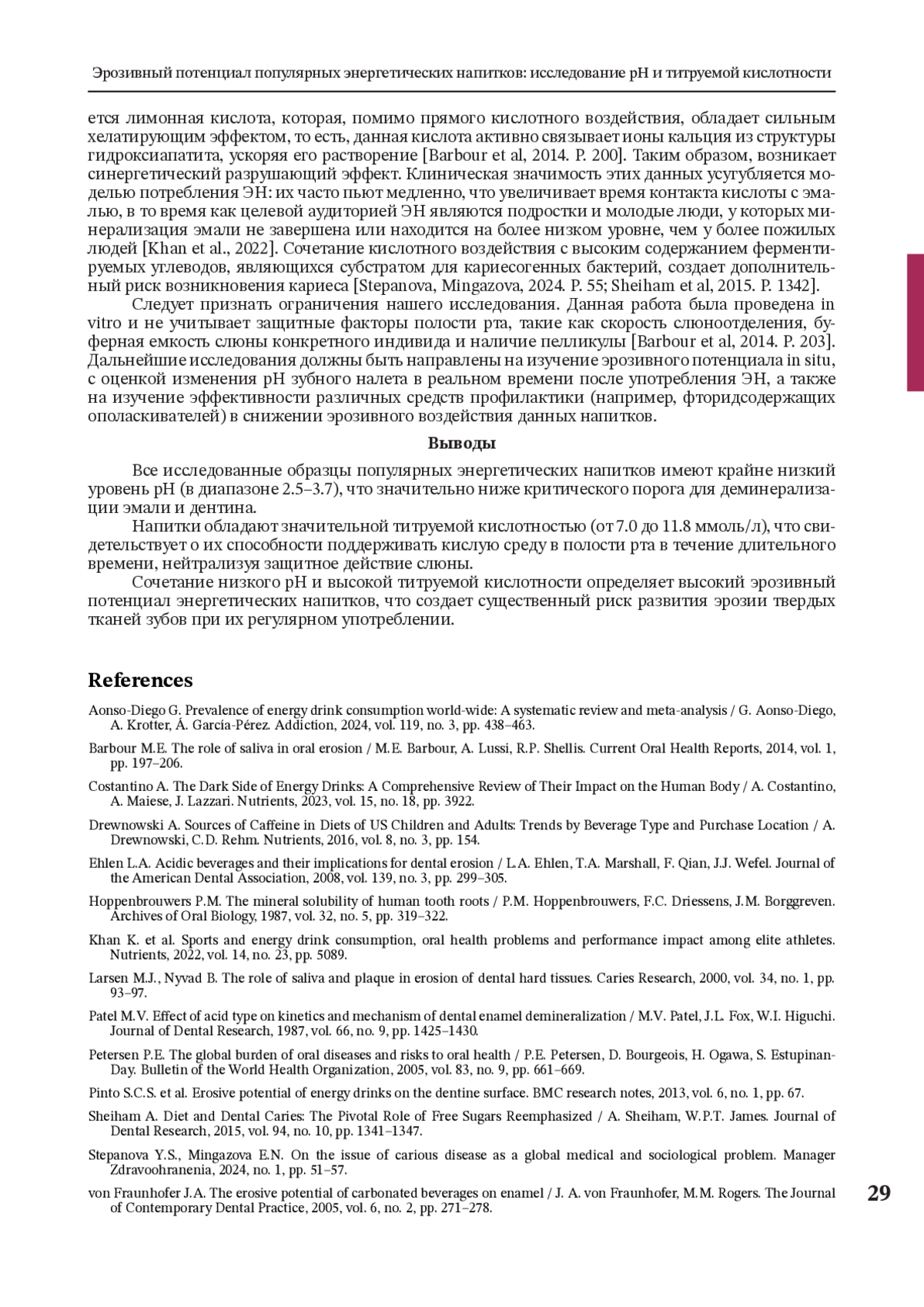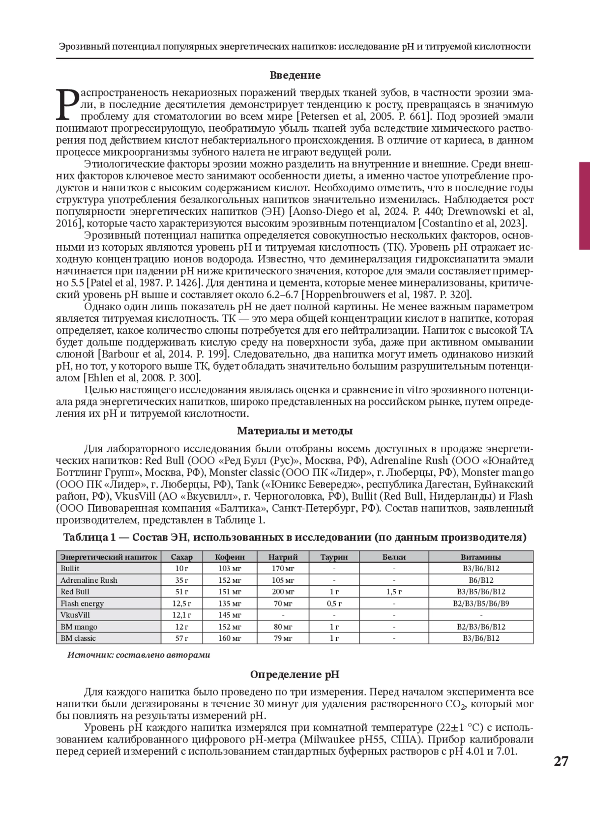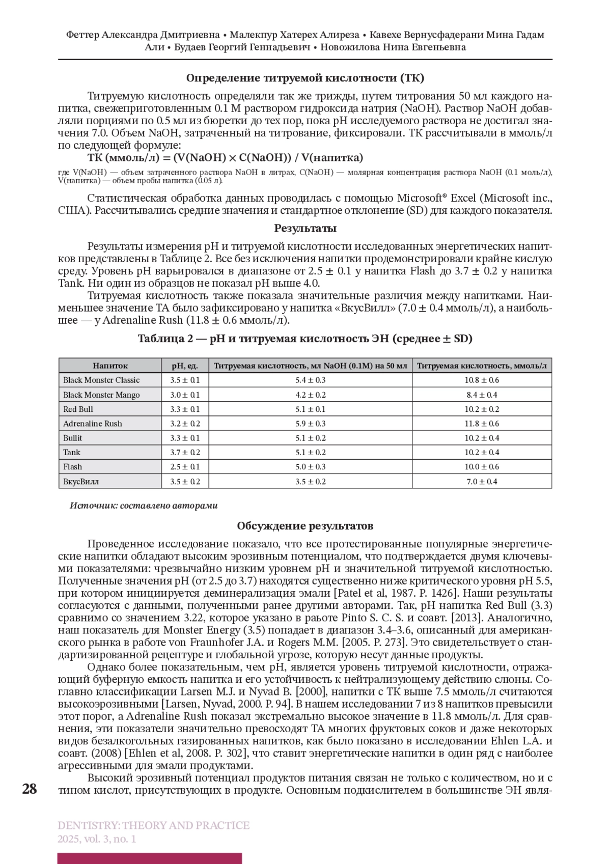 Статья: Эрозивный потенциал популярных энергетических напитков: исследование pH и титруемой кислотности (2025)
