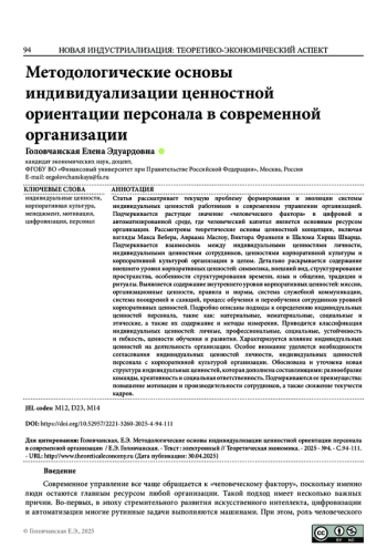 Статья рассматривает текущую проблему формирования и эволюции системы индивидуальных ценностей работников в современном управлении организацией. Подчеркивается растущее значение «человеческого фактора» в цифровой и автоматизированной среде, где человеческий капитал является основным ресурсом организации. Рассмотрены теоретические основы ценностной концепции, включая взгляды Макса Вебера, Авраама Маслоу, Виктора Франкеля и Шалома Хирша Шварца. Подчеркивается взаимосвязь между индивидуальными ценностями личности, индивидуальными ценностями сотрудников, ценностями корпоративной культуры и корпоративной культурой организации в целом. Детально раскрывается содержание внешнего уровня корпоративных ценностей: символика, внешний вид, структурирование пространства, особенности структурирования времени, язык и общение, традиции и ритуалы. Выявляется содержание внутреннего уровня корпоративных ценностей: миссия, организационные ценности, правила и нормы, система служебной коммуникации, система поощрений и санкций, процесс обучения и переобучения сотрудников уровней корпоративных ценностей. Подробно описаны подходы к определению индивидуальных ценностей персонала, такие как: материальные, нематериальные, социальные и этические, а также их содержание и методы измерения. Приводится классификация индивидуальных ценностей: личные, профессиональные, социальные, устойчивость и гибкость, ценности обучения и развития. Характеризуется влияние индивидуальных ценностей на деятельность организации. Особое внимание уделяется необходимости согласования индивидуальных ценностей личности, индивидуальных ценностей персонала с корпоративной культурой организации. Обоснована и уточнена новая структура индивидуальных ценностей, которая дополнена составляющими: разнообразие команды, креативность и социальная ответственность. Подчеркиваются ее преимущества: повышение мотивации и производительности сотрудников, а также снижение текучести кадров.