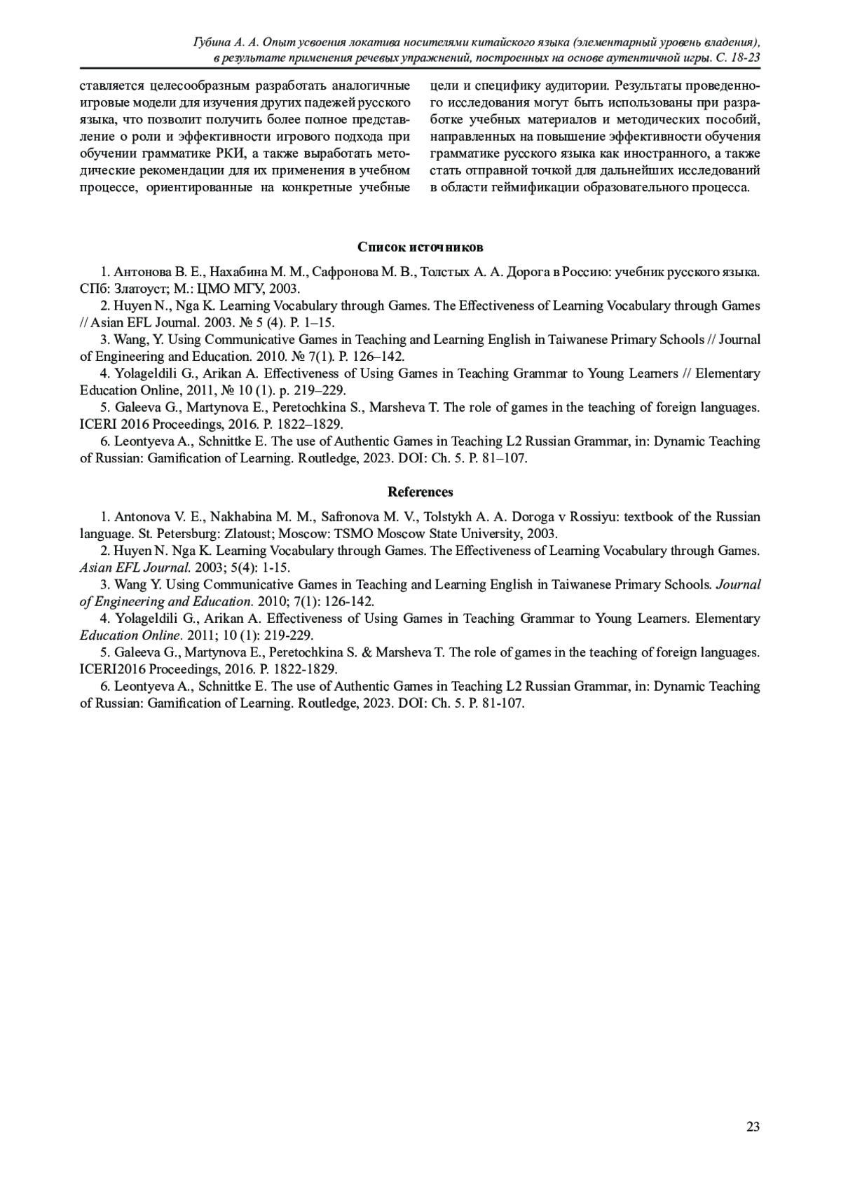 6. Leontyeva A., Schnittke E. The use of Authentic Games in Teaching L2 Russian Grammar, in: Dynamic Teaching of Russian: Gamification of Learning. Routledge, 2023. https://doi.org/Ch. 5. P. 81-107.