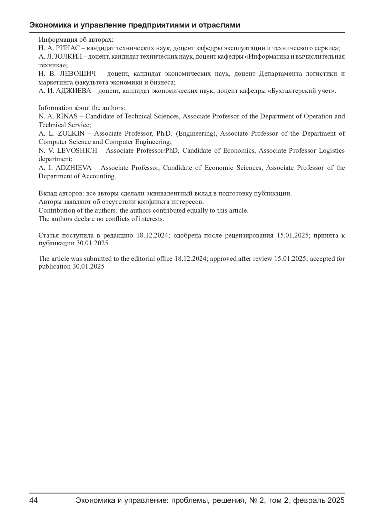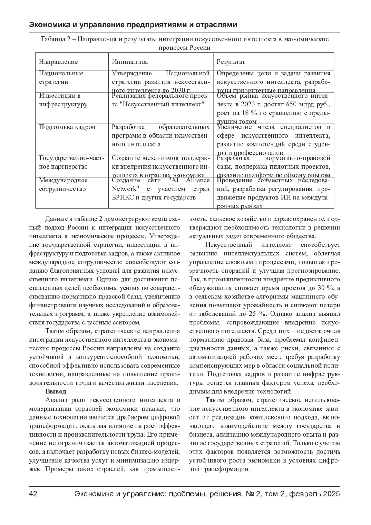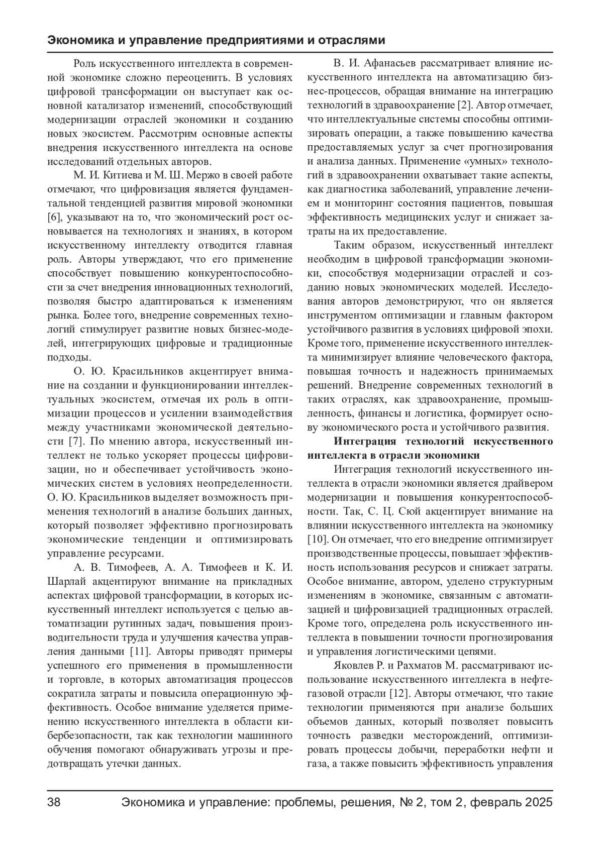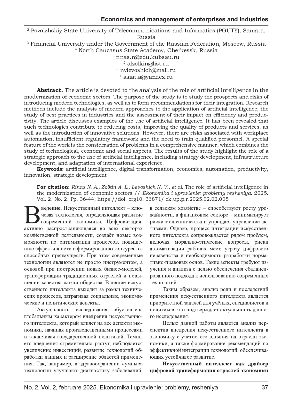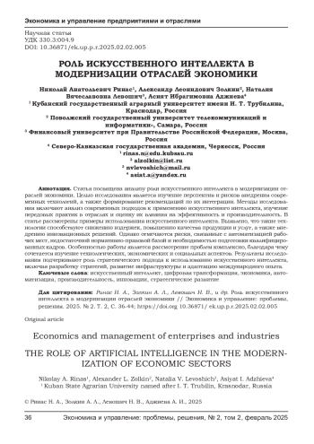 РИНАС Н. А., ЗОЛКИН А. Л., ЛЕВОШИЧ Н. В., АДЖИЕВА А. И. РОЛЬ ИСКУССТВЕННОГО ИНТЕЛЛЕКТА В МОДЕРНИЗАЦИИ ОТРАСЛЕЙ ЭКОНОМИКИ // ЭКОНОМИКА И УПРАВЛЕНИЕ: ПРОБЛЕМЫ, РЕШЕНИЯ. 2025. ТОМ 2 № 2