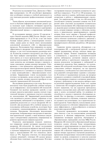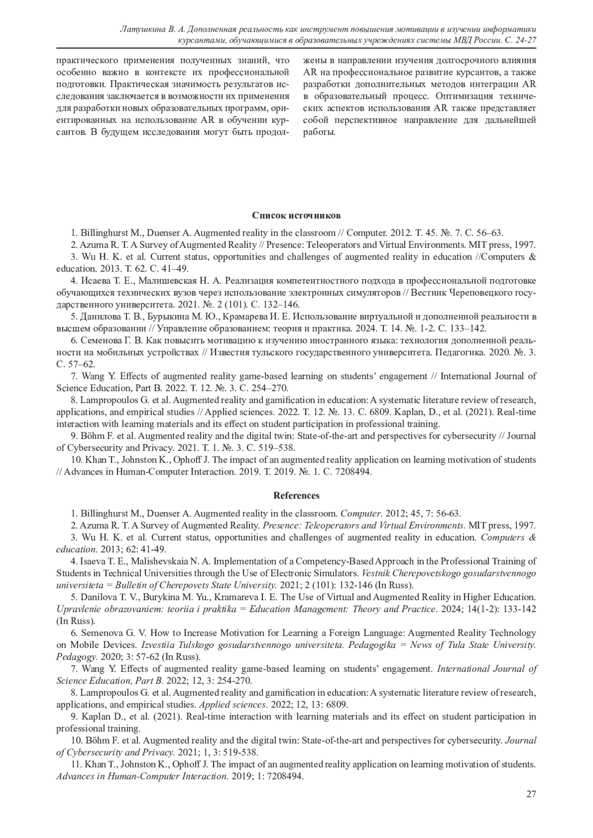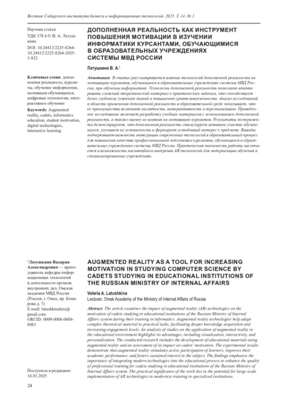 ЛАТУШКИНА В. А. ДОПОЛНЕННАЯ РЕАЛЬНОСТЬ КАК ИНСТРУМЕНТ ПОВЫШЕНИЯ МОТИВАЦИИ В ИЗУЧЕНИИ ИНФОРМАТИКИ КУРСАНТАМИ, ОБУЧАЮЩИМИСЯ В ОБРАЗОВАТЕЛЬНЫХ УЧРЕЖДЕНИЯХ СИСТЕМЫ МВД РОССИИ // ВЕСТНИК СИБИРСКОГО ИНСТИТУТА БИЗНЕСА И ИНФОРМАЦИОННЫХ ТЕХНОЛОГИЙ. 2025. ТОМ 14, № 1