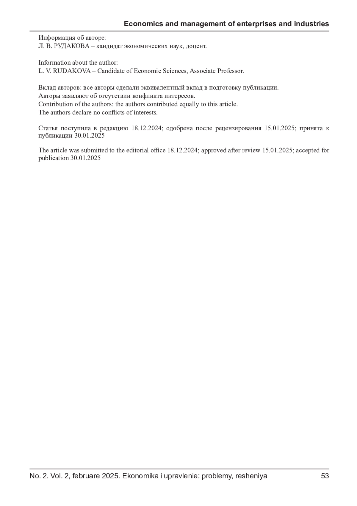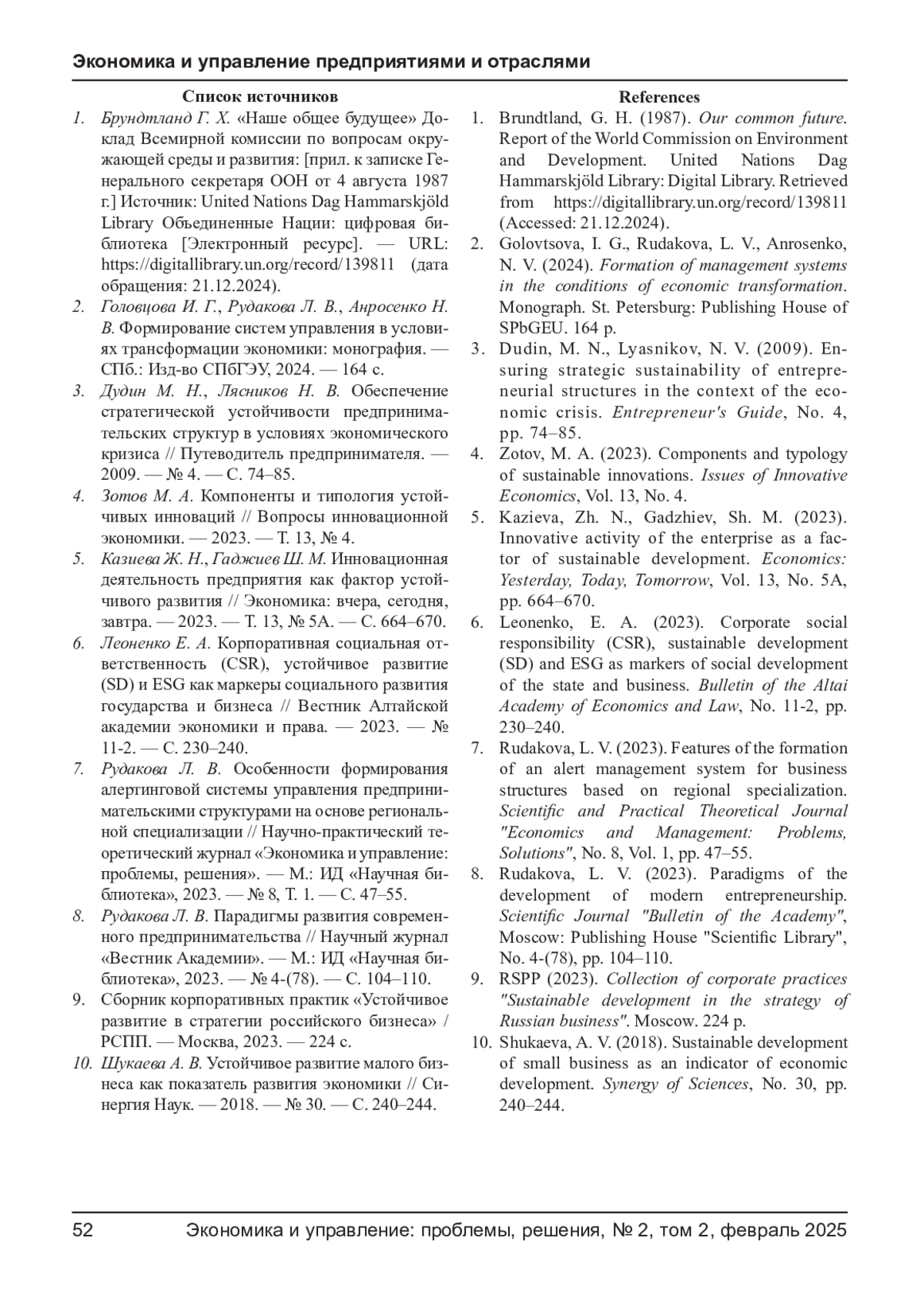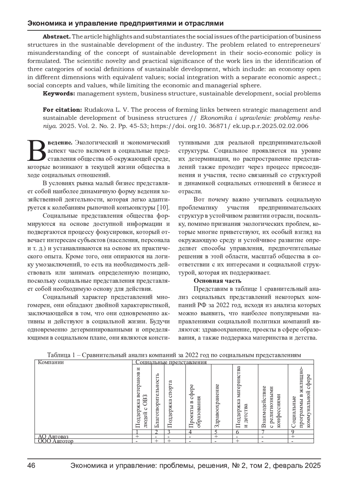 РУДАКОВА Л. В. СОЦИАЛЬНАЯ ПРОБЛЕМАТИКА УЧАСТИЯ ПРЕДПРИНИМАТЕЛЬСКИХ СТРУКТУР В УСТОЙЧИВОМ РАЗВИТИИ ОТРАСЛИ // ЭКОНОМИКА И УПРАВЛЕНИЕ: ПРОБЛЕМЫ, РЕШЕНИЯ. 2025. ТОМ 2 № 2