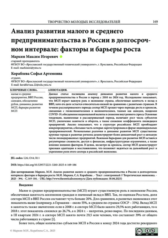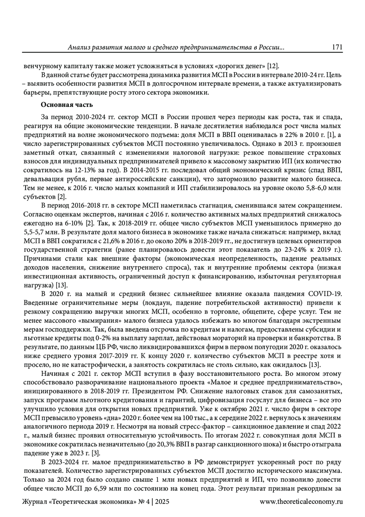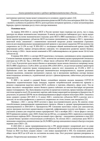 Данная статья посвящена анализу динамики развития малого и среднего предпринимательства в России в период с 2010 по 2024 год. Исследование показывает, что МСП играет важную роль в экономике страны, обеспечивая занятость и вклад в ВВП, хотя его доля остается относительно низкой по сравнению с развитыми странами. В течение рассматриваемого периода сектор МСП прошел через периоды роста и кризисов, связанных с геоэкономическими и экономическими, такими как санкции, пандемия COVID-19, обесценение национальной валюты и снижение внутреннего спроса. Основные тенденции, выявленные в рассматриваемый период, включают рост числа субъектов МСП, увеличение занятости и оборота, а также снижение коэффициента ликвидации предприятий. Анализ показывает, что в структуре российских МСП преобладают микропредприятия, а большая часть которых зарегистрирована в форме индивидуальных предпринимателей. Региональные различия в динамике развития МСП существенны: крупные города и развитые регионы демонстрируют более динамичный рост и меньшую число ликвидированных предприятий. Важными барьерами для развития МСП остаются регуляторные сложности, доступ к финансам, инфраструктурные ограничения, а также влияние внешних факторов. В целом, несмотря на кризисы, сектор МСП демонстрирует признаки адаптации и восстановления, что позволяет надеяться на дальнейший рост и укрепление роли этого сектора в российской экономике.