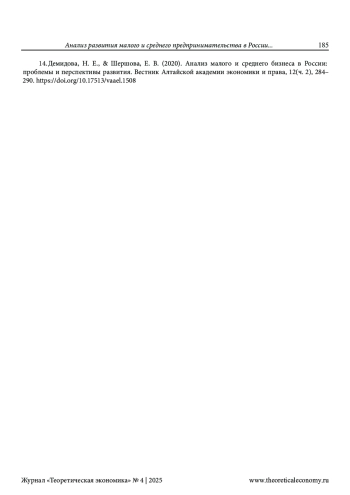 14. Демидова, Н. Е., & Шершова, Е. В. (2020). Анализ малого и среднего бизнеса в России: проблемы и перспективы развития. Вестник Алтайской академии экономики и права, 12(ч. 2), 284-290. DOI: 10.17513/vaael.1508