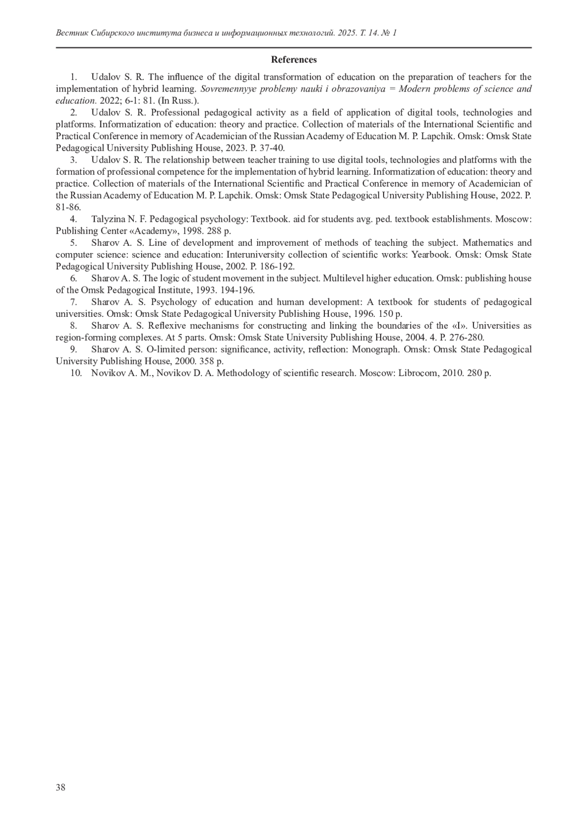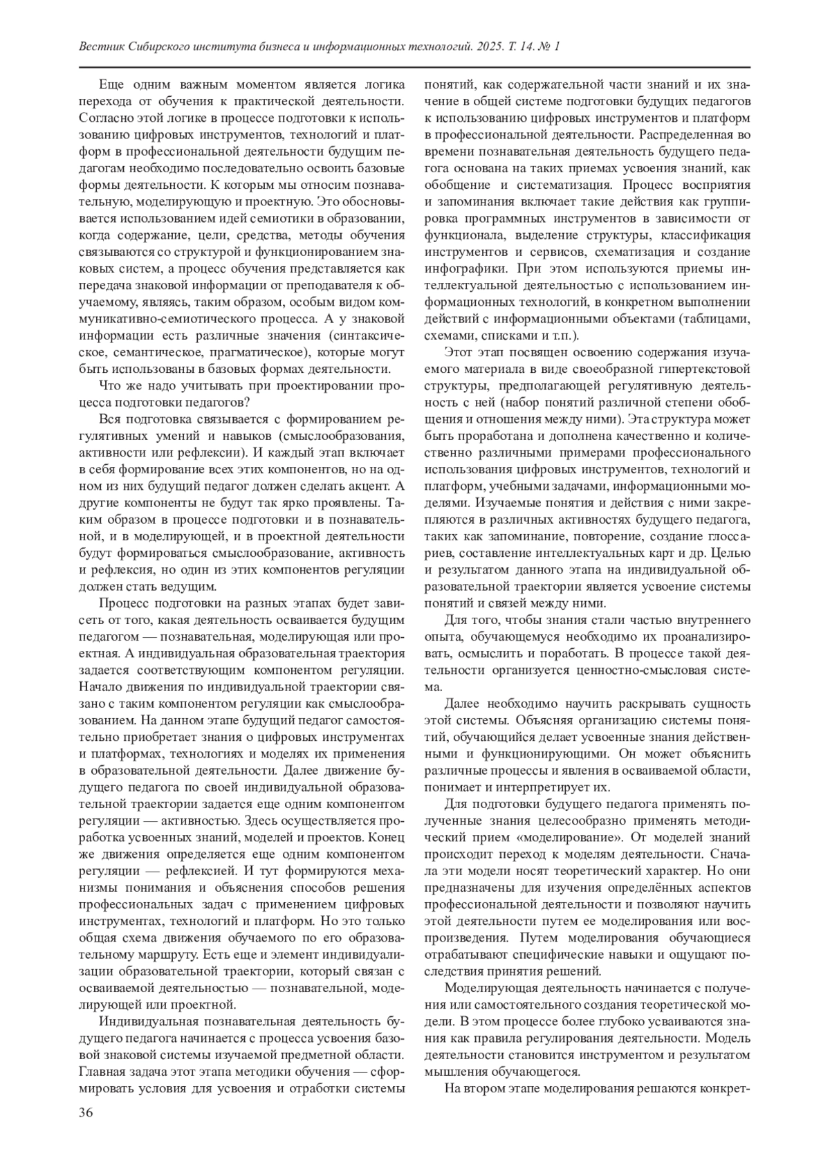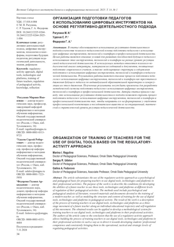 РАГУЛИНА М. И., УДАЛОВ С. Р., ФЕДОРОВА Г. А. ОРГАНИЗАЦИЯ ПОДГОТОВКИ ПЕДАГОГОВ К ИСПОЛЬЗОВАНИЮ ЦИФРОВЫХ ИНСТРУМЕНТОВ НА ОСНОВЕ РЕГУЛЯТИВНО-ДЕЯТЕЛЬНОСТНОГО ПОДХОДА // ВЕСТНИК СИБИРСКОГО ИНСТИТУТА БИЗНЕСА И ИНФОРМАЦИОННЫХ ТЕХНОЛОГИЙ. 2025. ТОМ 14, № 1