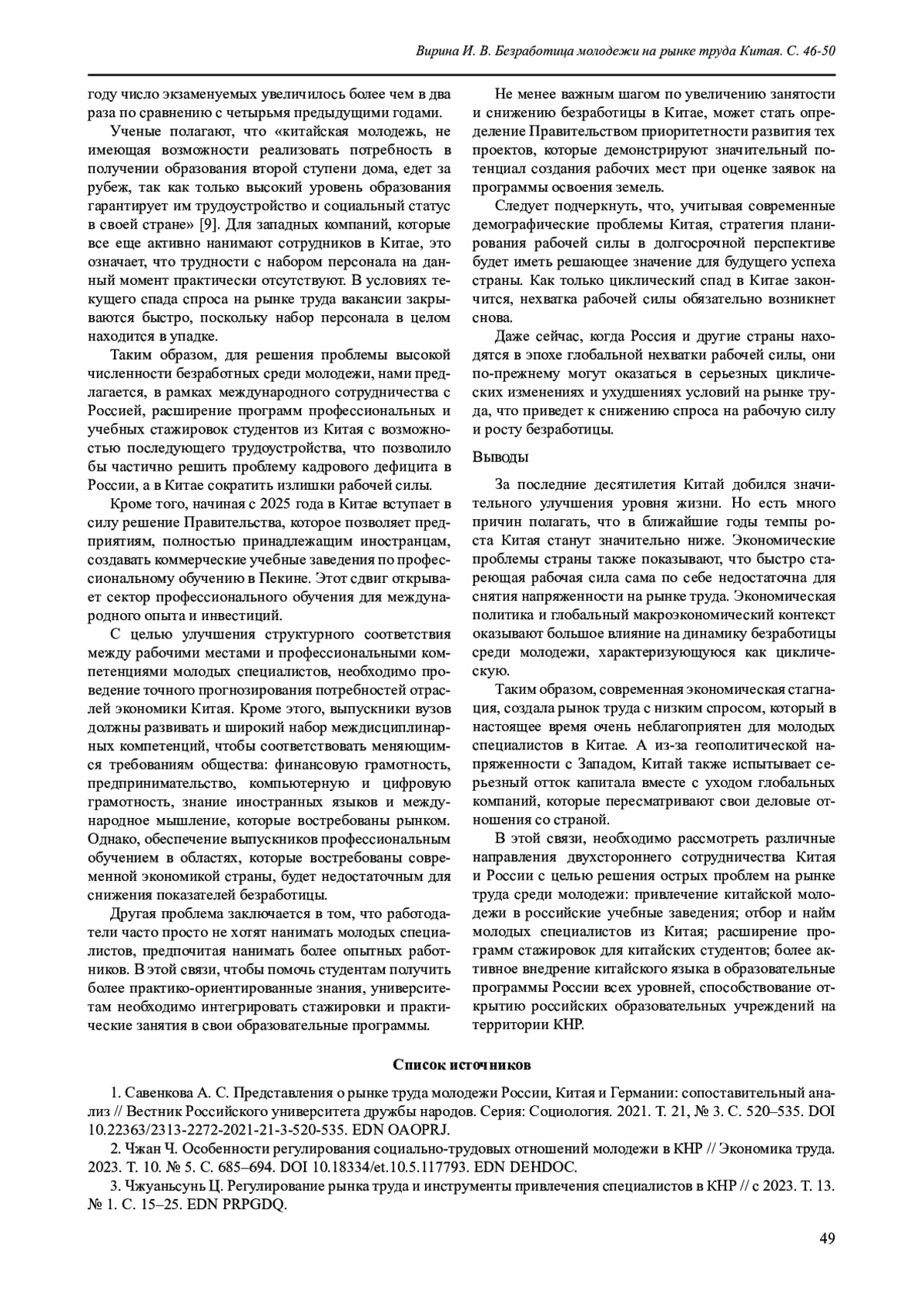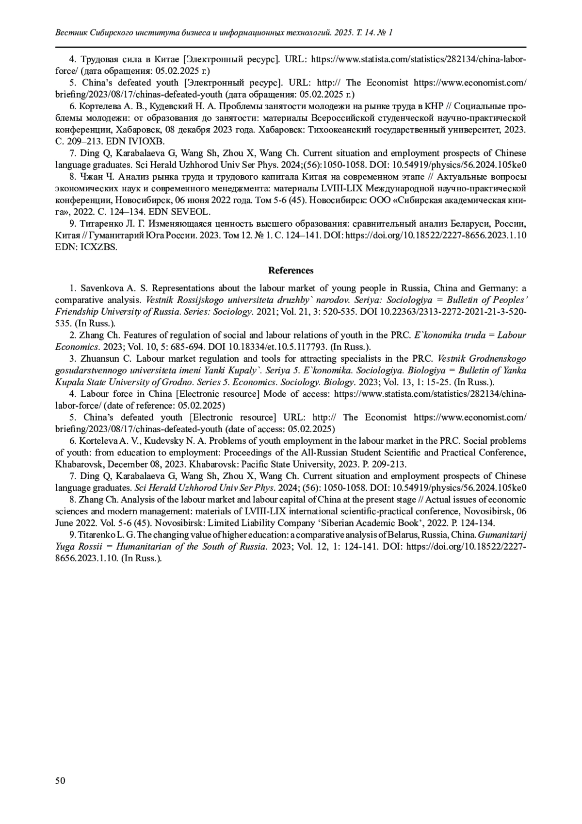 1. Савенкова А. С. Представления о рынке труда молодежи России, Китая и Германии: сопоставительный анализ // Вестник Российского университета дружбы народов. Серия: Социология. 2021. Т. 21, № 3. С. 520-535. https://doi.org/10.22363/2313-2272-2021-21-3-520-535. EDN OAOPRJ.