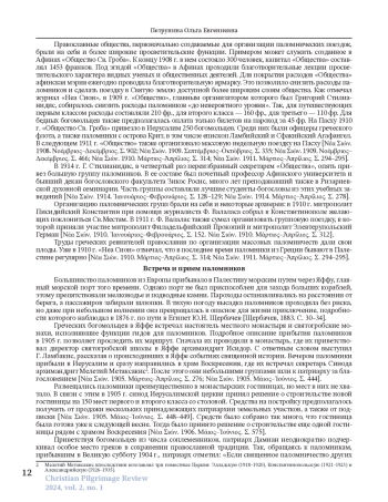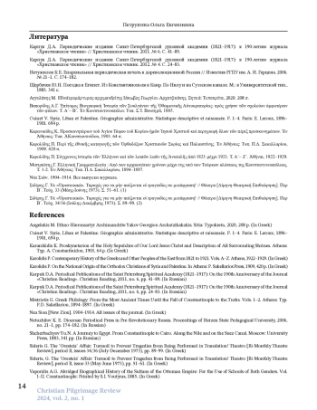 В статье разносторонне исследуется паломничество в Палестину в начале XX в., по материалам журнала «Неа Сион» («Новый Сион»), который с 1904 г. начал издавать Иерусалимский патриархат. Это издание является ценным источником для изучения разных аспектов паломнического движения в Святую землю в указанный период. В журнале содержится информация о национальной принадлежности, вероисповедании и социальном статусе паломников, уделяется особое внимание греческим и русским православным богомольцам. Анализ материалов издания показывает, что большинство паломников прибывали на Страстной седмице, часто путешествуя организованными группами при поддержке церковных властей и паломнических обществ. Журнал фиксирует колебания числа паломников, вызванные политическими событиями, такими как русско-японская война и Балканские войны. Хотя греки считали себя особенно близкими к Святым местам, количество греческих паломников часто оказывалось меньше из-за более развитых систем организации паломничества у других национальностей. Издание также освещает визиты видных религиозных и политических деятелей, включая членов королевских семей и высшее духовенство. Хотя основное внимание уделялось православным христианам, журнал иногда упоминал католических и мусульманских паломников. Патриарх Дамиан и редакция журнала неоднократно выражали обеспокоенность по поводу краткости многих паломничеств, что ограничивало посетителей лишь главными достопримечательностями Иерусалима, не давая времени на более широкое исследование библейских мест. Рост потока туристов, также отмеченный журналом, демонстрирует как религиозную, так и культурную значимость Палестины в начале XX в.