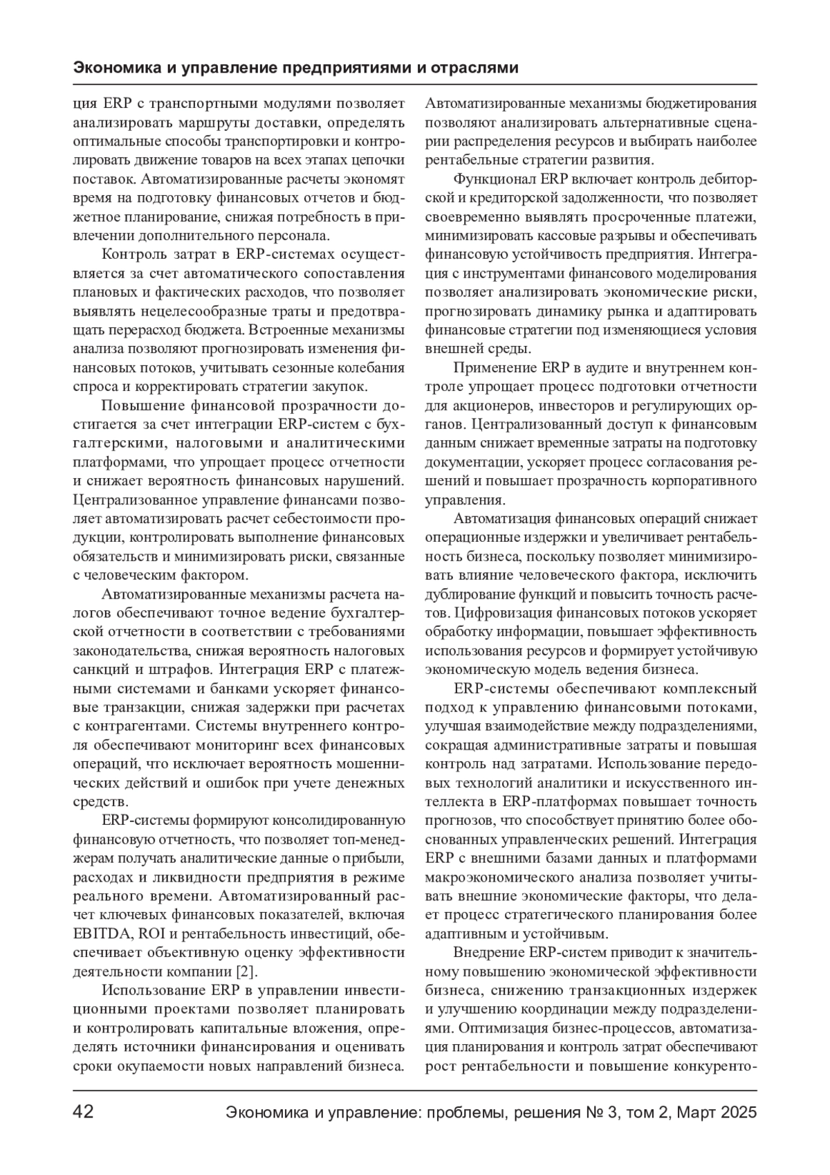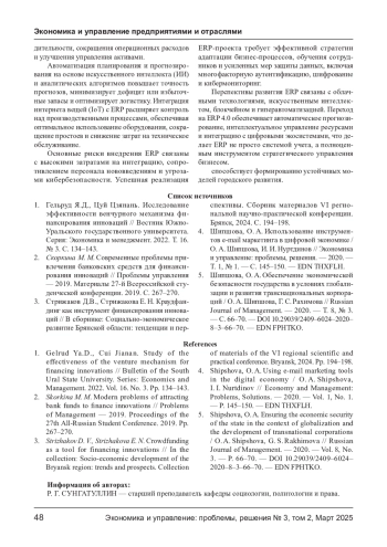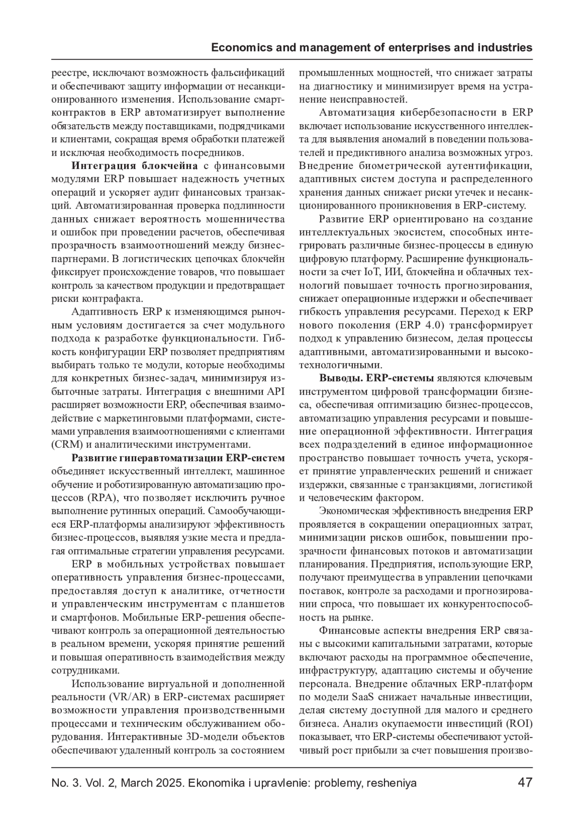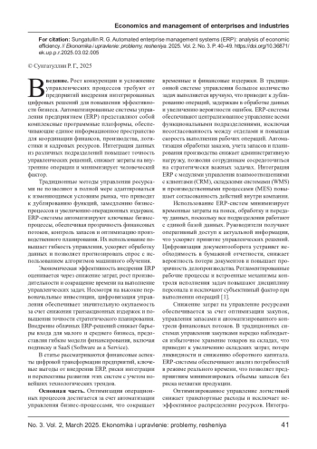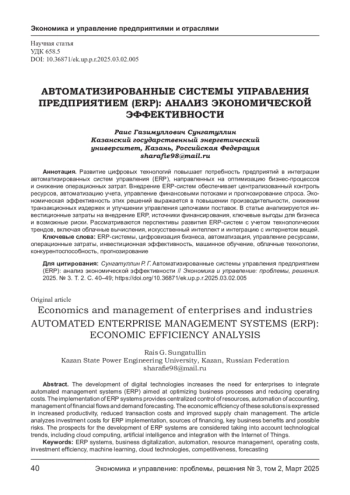 Развитие цифровых технологий повышает потребность предприятий в интеграции автоматизированных систем управления (ERP), направленных на оптимизацию бизнес- процессов и снижение операционных затрат. Внедрение ERP-систем обеспечивает централизованный контроль ресурсов, автоматизацию учета, управление финансовыми потоками и прогнозирование спроса. Экономическая эффективность этих решений выражается в повышении производительности, снижении транзакционных издержек и улучшении управления цепочками поставок. В статье анализируются инвестиционные затраты на внедрение ERP, источники финансирования, ключевые выгоды для бизнеса и возможные риски. Рассматриваются перспективы развития ERP-систем с учетом технологических трендов, включая облачные вычисления, искусственный интеллект и интеграцию с интернетом вещей.