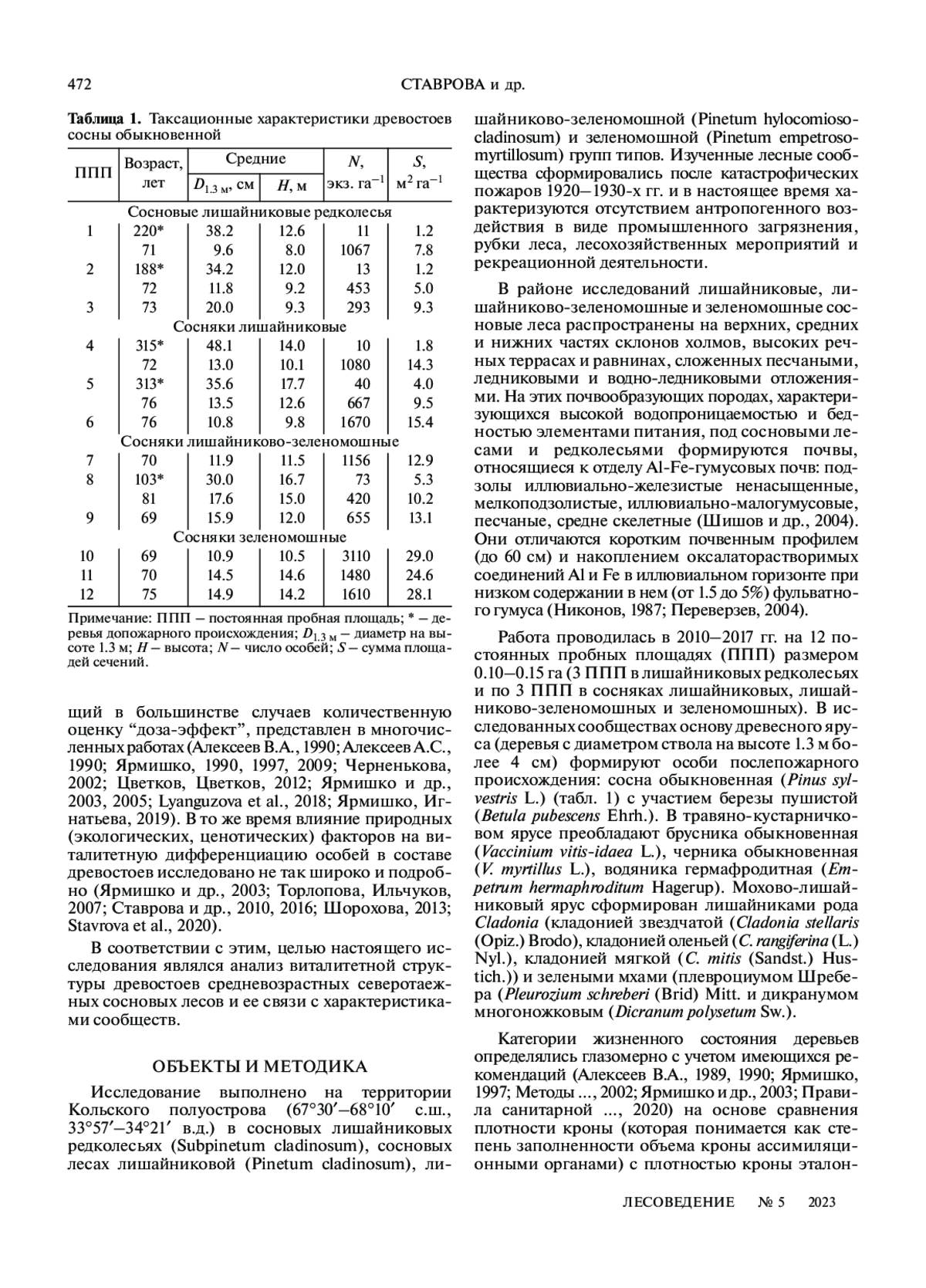 Анализ жизненного состояния деревьев и виталитетной структуры древостоев лесообразующих видов является одной из актуальных научных задач не только для мониторинга и оценки различных видов антропогенного воздействия на лесные сообщества (Tveite, 1987; Алексеев В. А., 1990; Ярмишко, 1990, 1997; Черненькова, 2002; Ярмишко и др., 2003; Dobbertin, 2005; Торлопова, Ильчуков, 2007; Kozlov et al., 2009; Augustaitis et al., 2010; Ставрова и др., 2010; Eichhorn, Roskams, 2013; Ярмишко, Игнатьева, 2019; Choi et al., 2021), но и для выявления закономерностей организации и динамики естественных лесных экосистем, развивающихся в отсутствие антропогенных нарушений (Бебия, 2000; Rötzer et al., 2005; Демидко, 2006; Кривец и др., 2008; Шорохова, 2013; Stavrova et al., 2020)