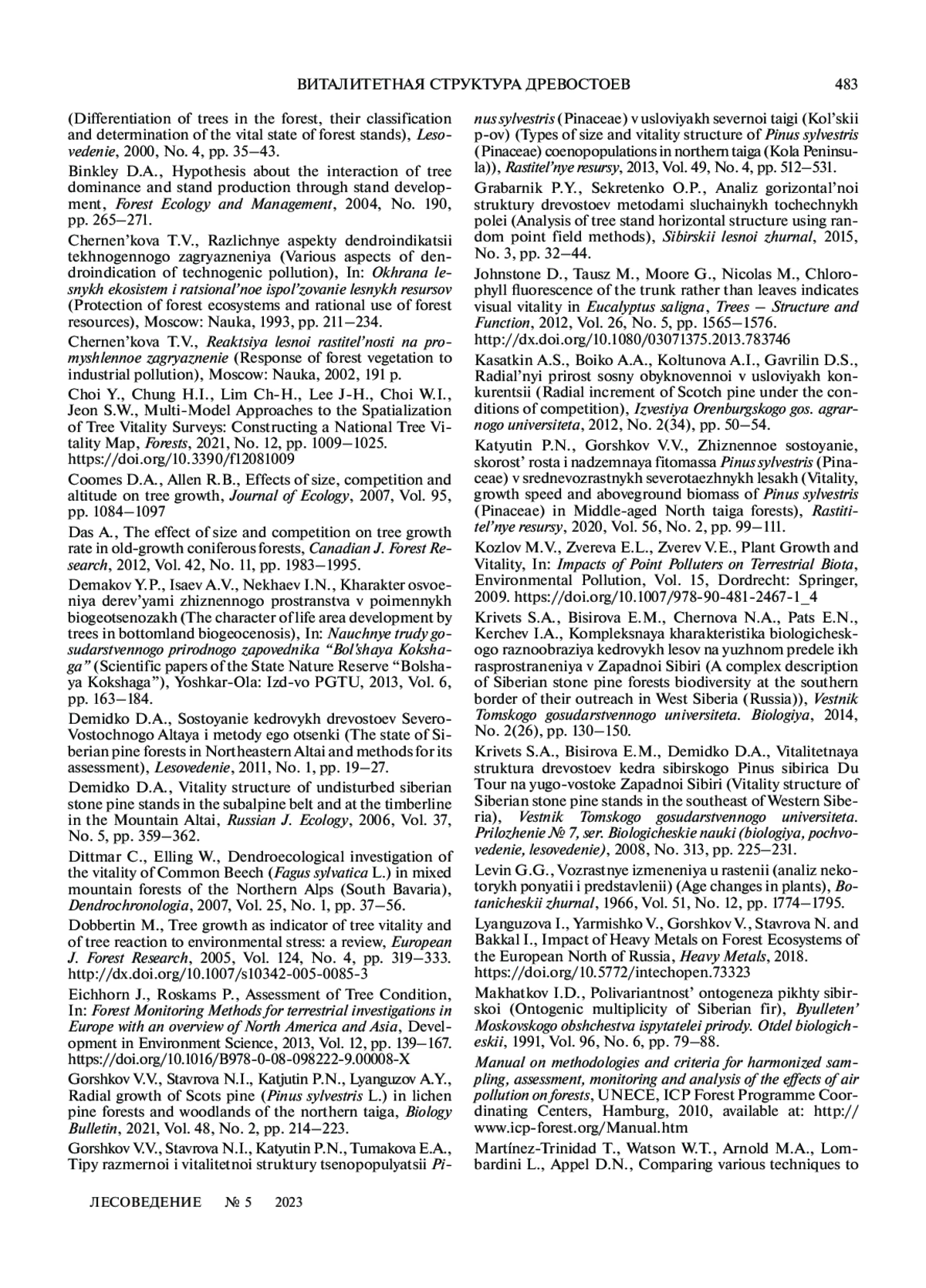 5. Бебия С.М. Дифференциация деревьев в лесу, их классификация и определение жизненного состояния древостоев // Лесоведение. 2000. № 4. С. 35–43.