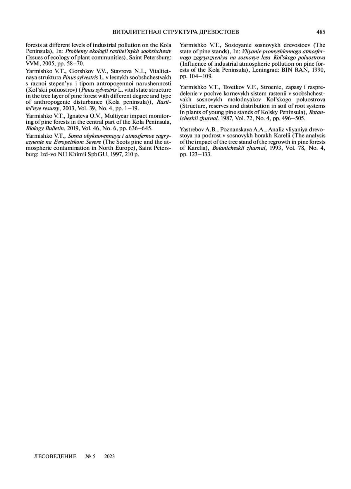 37. Ярмишко В.Т. Состояние сосновых древостоев // Влияние промышленного атмосферного загрязнения на сосновые леса Кольского полуострова. 1990. Л.: БИН РАН. С. 104–109.