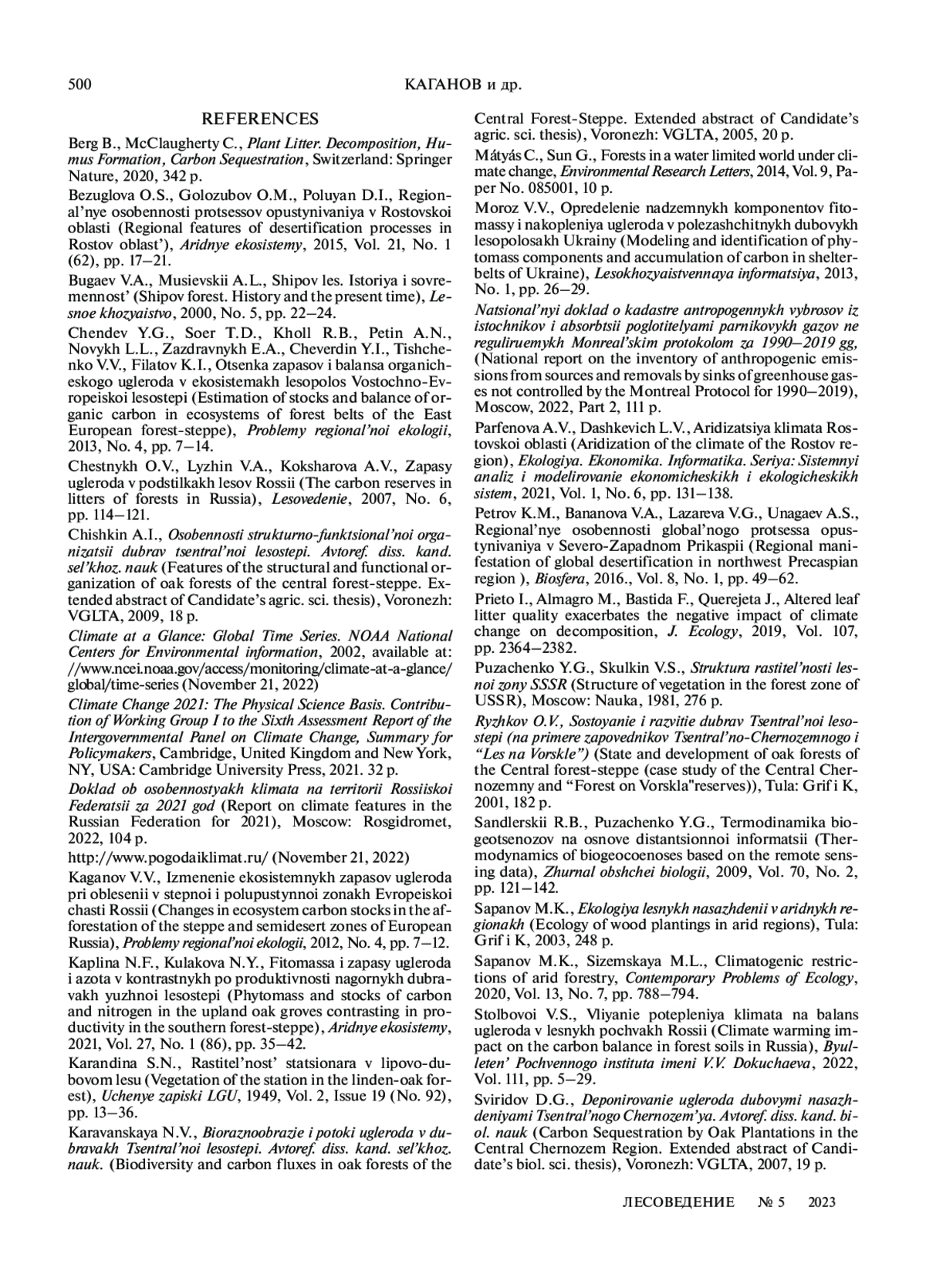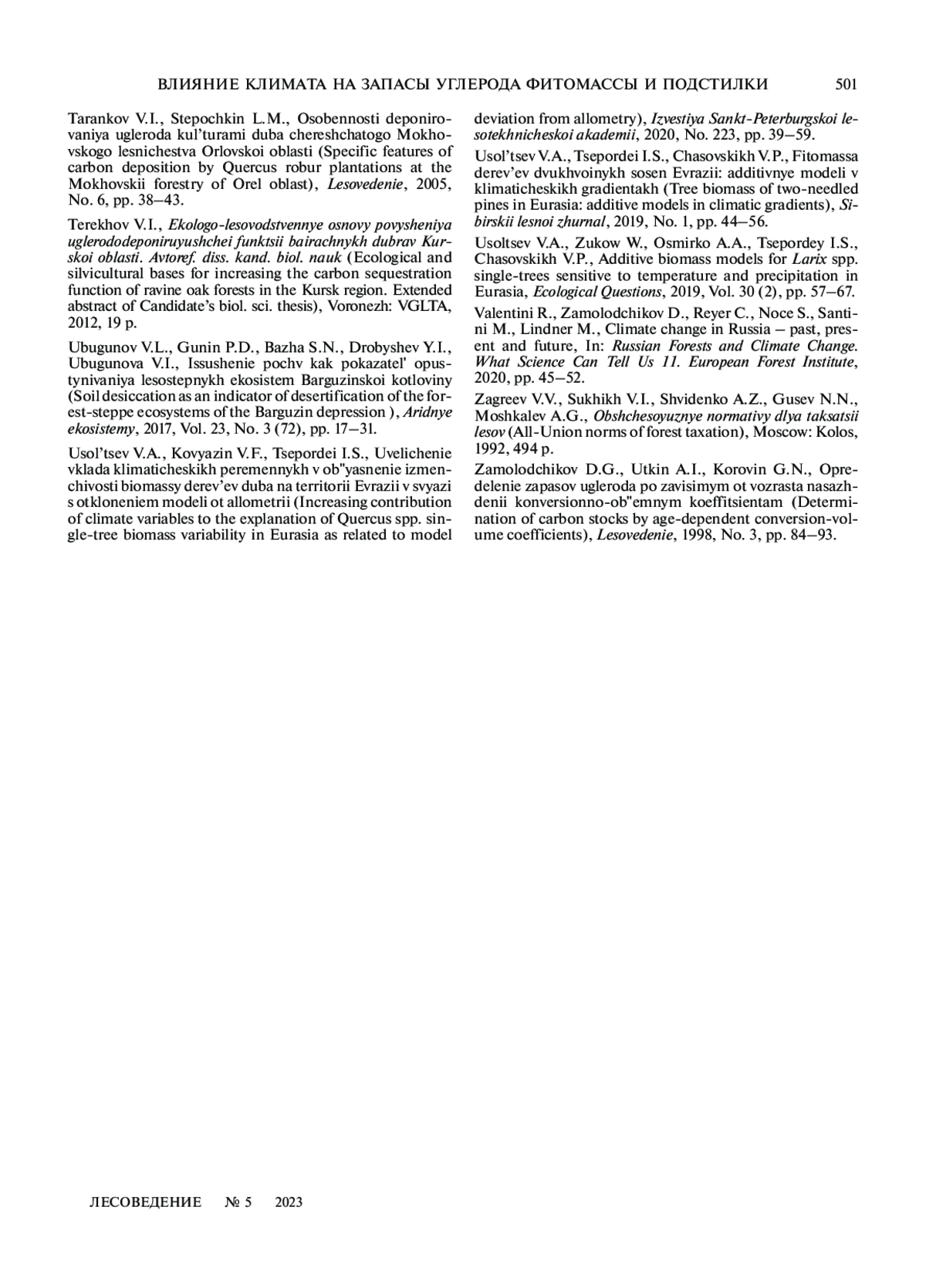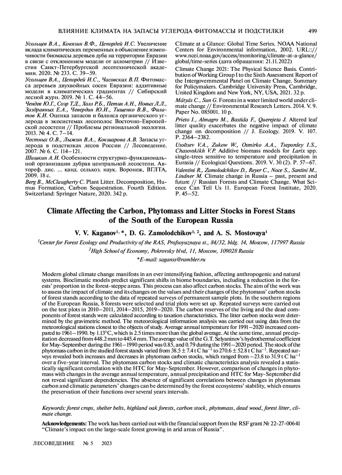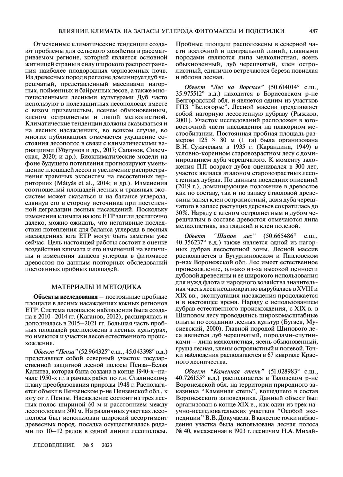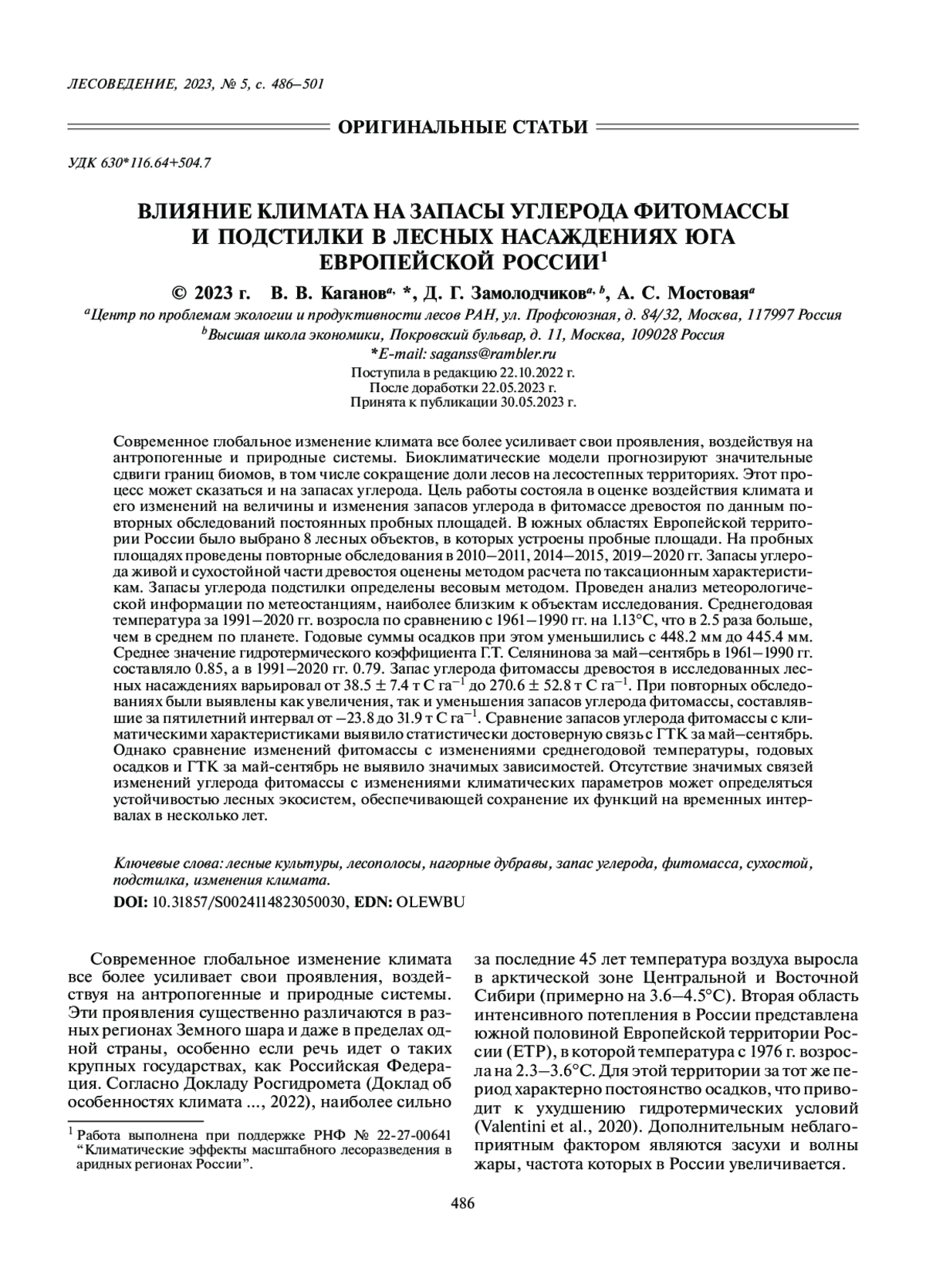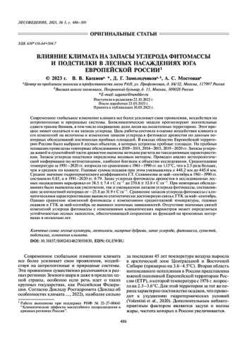 Статья: ВЛИЯНИЕ КЛИМАТА НА ЗАПАСЫ УГЛЕРОДА ФИТОМАССЫ И ПОДСТИЛКИ В ЛЕСНЫХ НАСАЖДЕНИЯХ ЮГА ЕВРОПЕЙСКОЙ РОССИИ (2023)