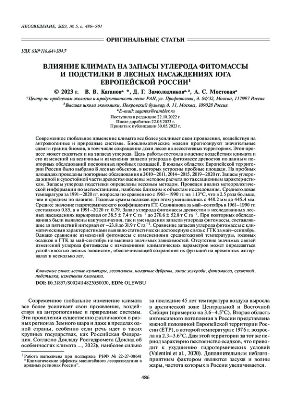 КАГАНОВ В. В., ЗАМОЛОДЧИКОВ Д. Г., МОСТОВАЯ А. С. ВЛИЯНИЕ КЛИМАТА НА ЗАПАСЫ УГЛЕРОДА ФИТОМАССЫ И ПОДСТИЛКИ В ЛЕСНЫХ НАСАЖДЕНИЯХ ЮГА ЕВРОПЕЙСКОЙ РОССИИ // ЛЕСОВЕДЕНИЕ. 2023. № 5