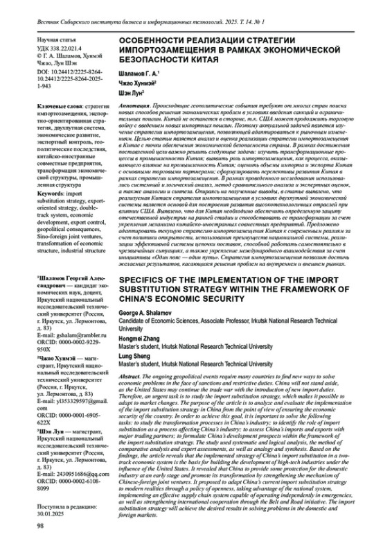 Происходящие геополитические события требуют от многих стран поиска новых способов решения экономических проблем в условиях введения санкций и ограничительных пошлин. Китай не останется в стороне, т. к. США может продолжить торговую войну с введением новых импортных пошлин. Поэтому актуальной задачей является изучение стратегии импортозамещения, позволяющей адаптироваться к рыночным изменениям. Целью статьи является анализ и оценка реализации стратегии импортозамещения в Китае с точки обеспечения экономической безопасности страны. В рамках достижения поставленной цели важно решить следующие задачи: изучить трансформационные процессы в промышленности Китая; выявить роль импортозамещения, как процесса, оказывающего влияние на промышленность Китая; оценить объемы импорта и экспорта Китая с основными торговыми партнерами; сформулировать перспективы развития Китая в рамках стратегии импортозамещения. В рамках проведенного исследования использовались системный и логический анализ, метод сравнительного анализа и экспертных оценок, а также аналогии и синтеза. Опираясь на полученные выводы, в статье выявлено, что реализуемая Китаем стратегия импотозамещения в условиях двухпутной экономической системы является основой для построения развития высокотехнологичных отраслей при влиянии США. Выявлено, что для Китая необходимо обеспечить определенную защиту отечественной индустрии на ранней стадии и способствовать ее трансформации за счет укрепления механизма китайско-иностранных совместных предприятий. Предложено адаптировать текущую стратегию импортозамещения Китая к современным реалиям за счет политики открытости, использования преимуществ национальной системы, реализации эффективной системы цепочки поставок, способной работать самостоятельно в чрезвычайных ситуациях, а также укрепление международного взаимодействия за счет инициативы «Один пояс — один путь». Стратегия импортозамещения позволит достичь желаемых результатов, касающихся решения проблем на внутреннем и внешнем рынках.