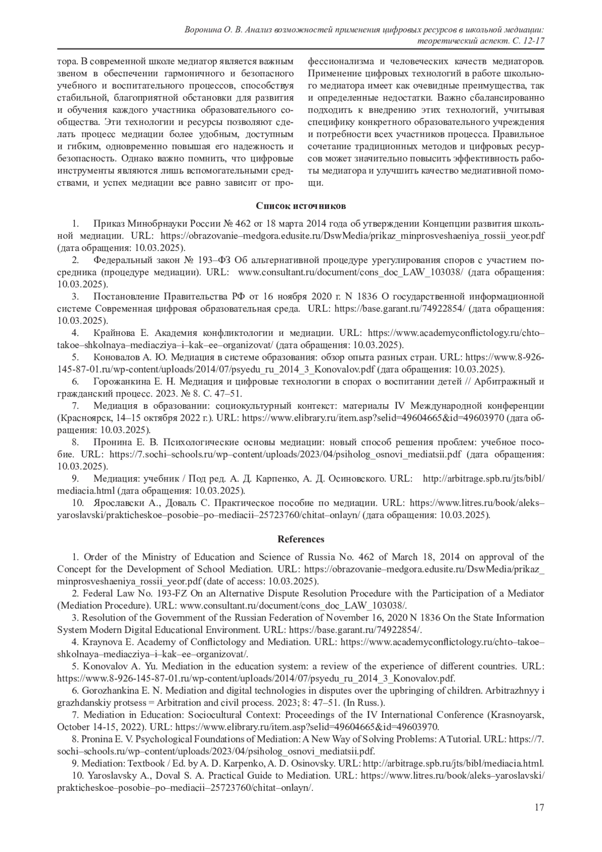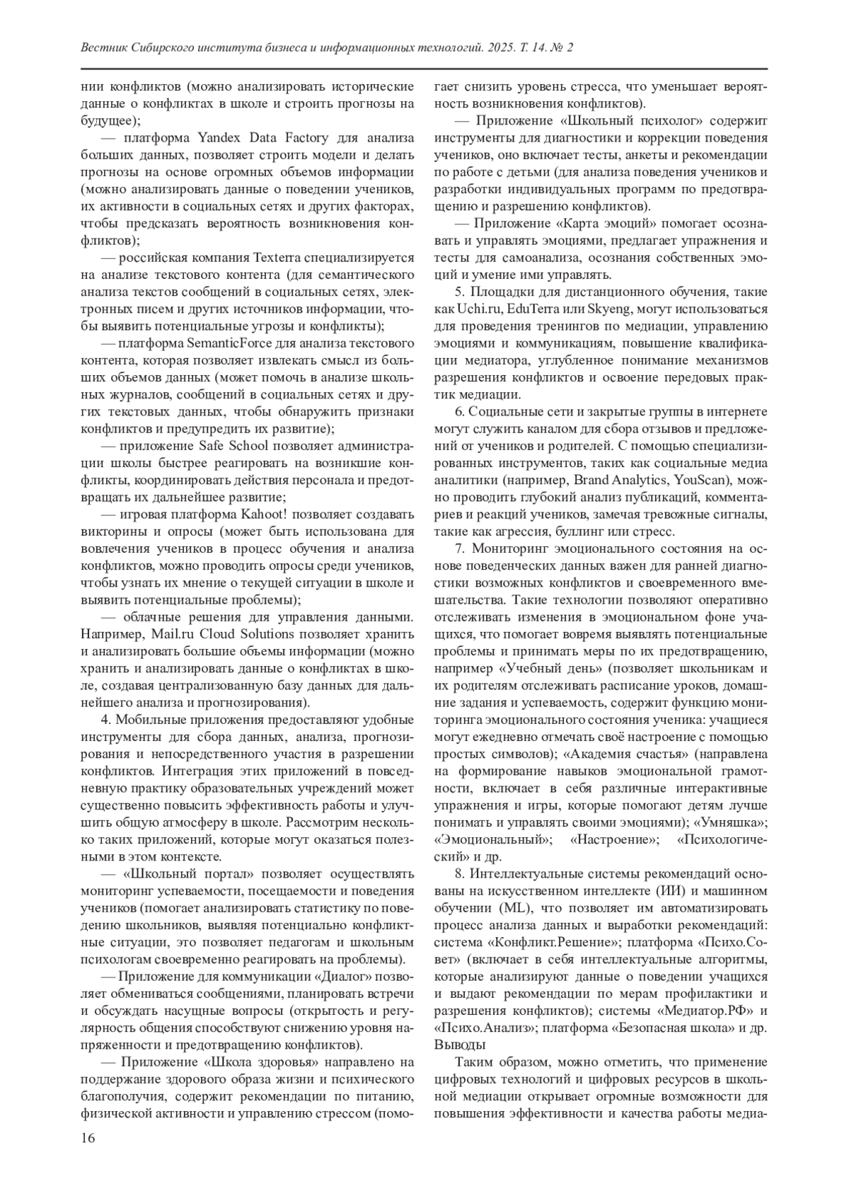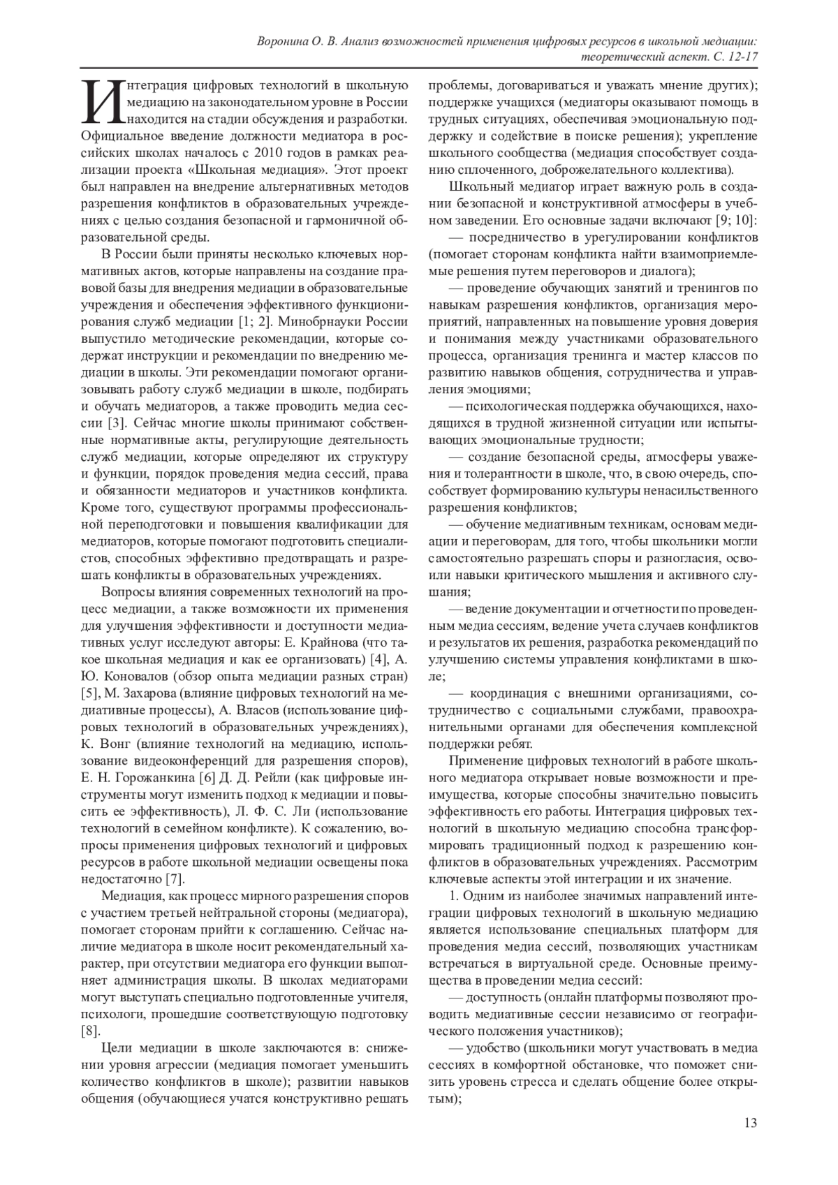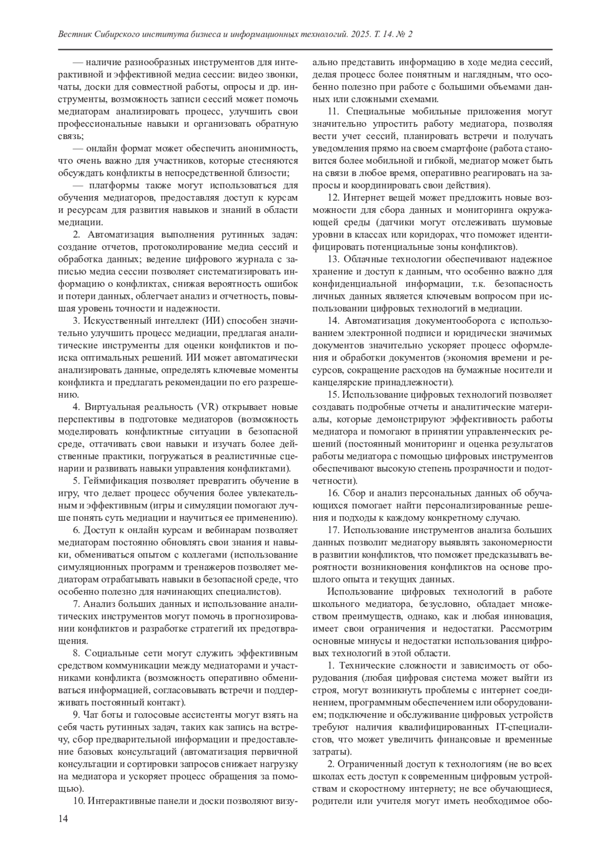 ВОРОНИНА О. В. АНАЛИЗ ВОЗМОЖНОСТЕЙ ПРИМЕНЕНИЯ ЦИФРОВЫХ РЕСУРСОВ В ШКОЛЬНОЙ МЕДИАЦИИ: ТЕОРЕТИЧЕСКИЙ АСПЕКТ // ВЕСТНИК СИБИРСКОГО ИНСТИТУТА БИЗНЕСА И ИНФОРМАЦИОННЫХ ТЕХНОЛОГИЙ. 2025. ТОМ 14, № 2