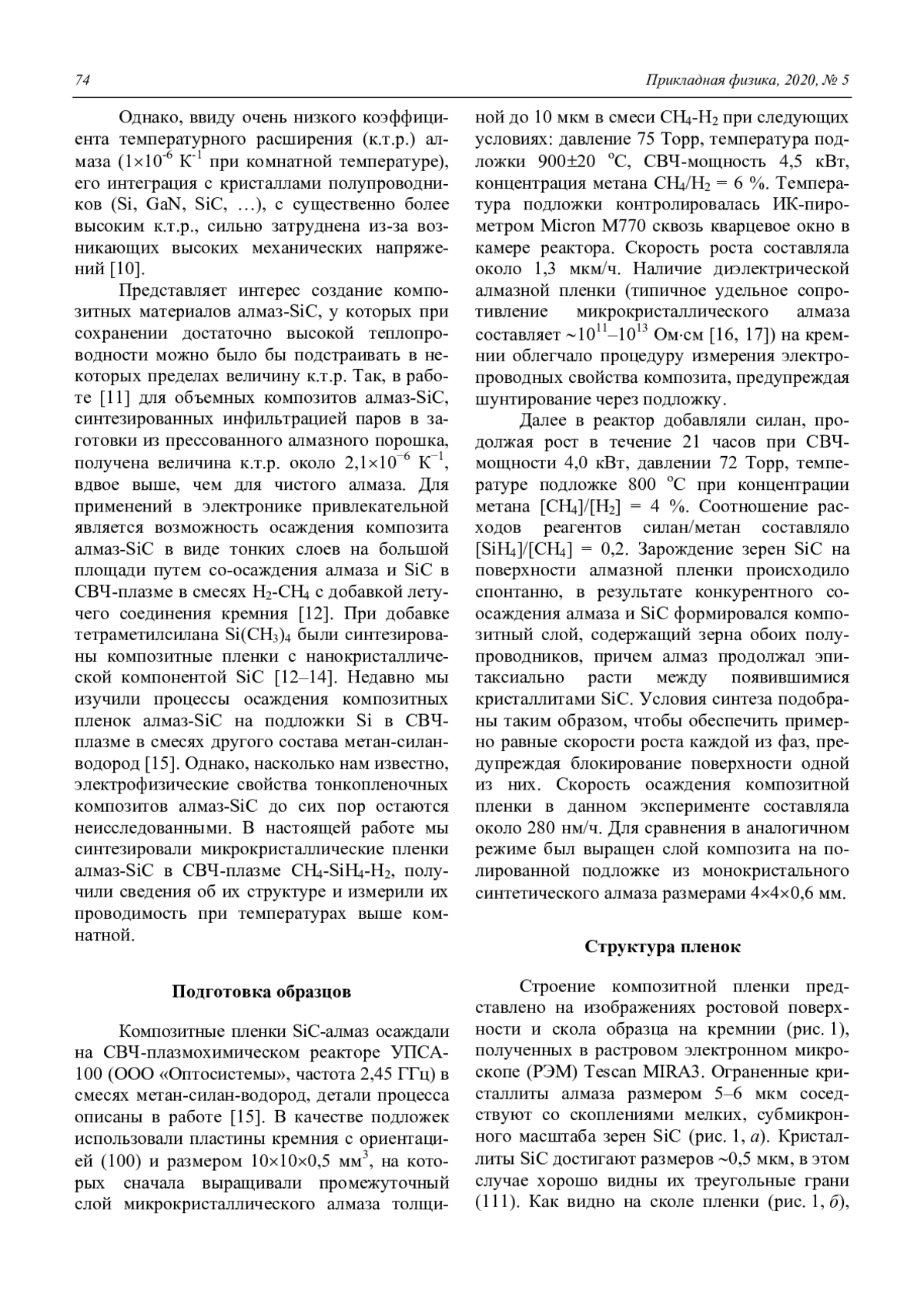 Мартьянов А. К., Седов В. С., Попович А. Ф., Савин С. С., Хомич А. А., Ральченко В. Г., Конов В. И. Электропроводность композитных пленок карбид кремния-алмаз, синтезированных в СВЧ-разряде в смесях метан-силан-водород 73