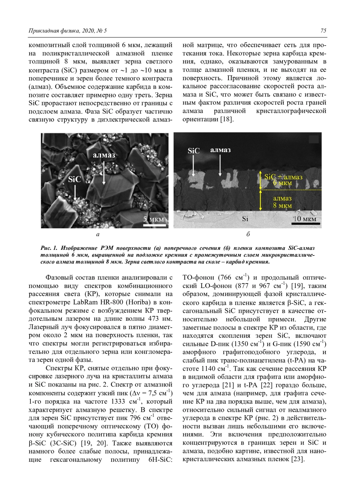 Мы вырастили в СВЧ-плазме в смеси SiH4-CH4-H2 композитные пленки алмазкарбид кремния в которых размер кристаллитов алмаза составляет несколько микрометров, а зерна SiC имеют субмикронный (<0,5 мкм) размер. На основе спектров КР сделан вывод о принадлежности карбида кремния к кубическому политипу 3C-SiC. Впервые измерены электрические свойства таких композитных пленок, которые характеризуются низким удельным сопротивлением (порядка 10-2 Омсм при температуре T = 340 К), и полупроводниковым типом температурной зависимости проводимости. Предположено, что проводимость в композите реализуется по связной цепи компоненты SiC в диэлектрической алмазной матрице.