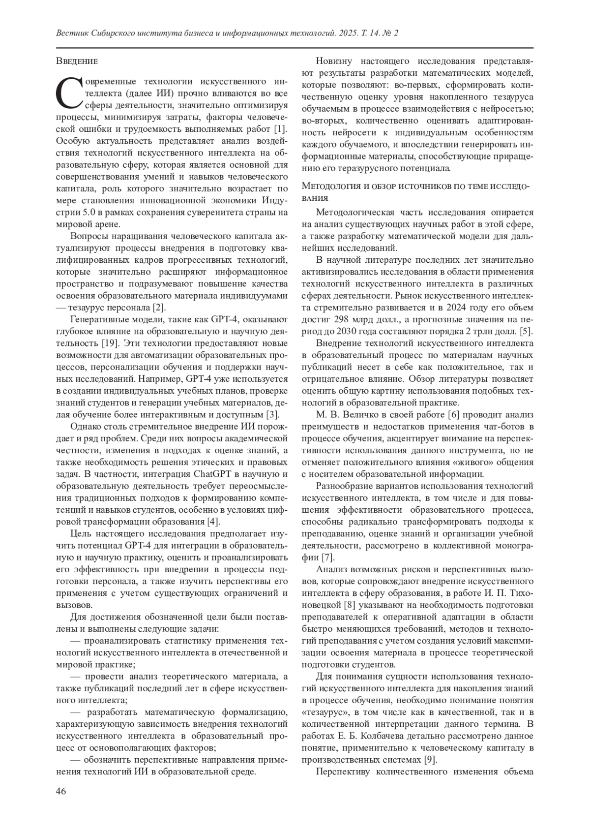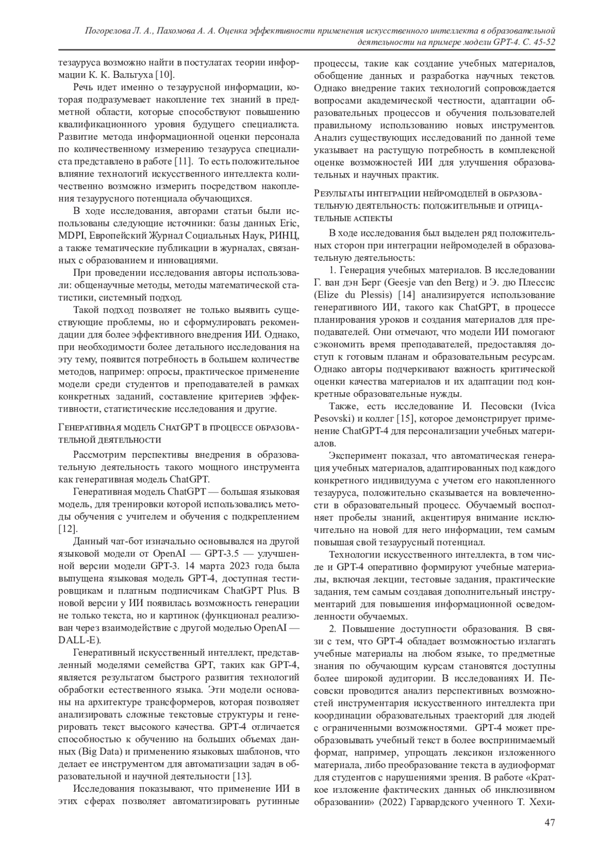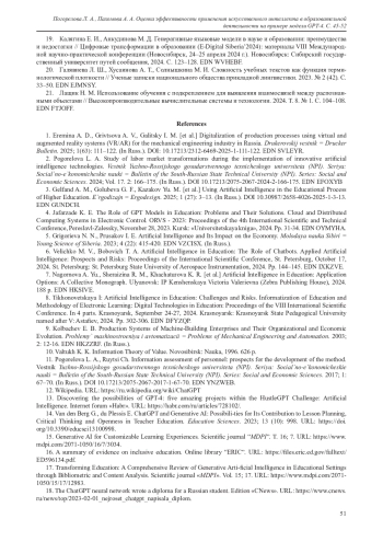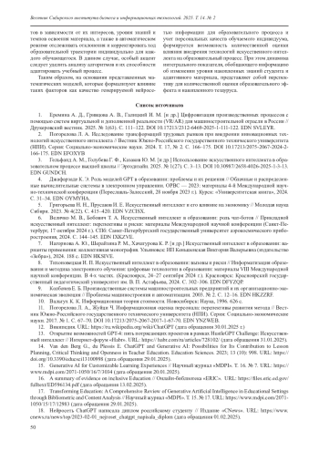 19. Калягина Е. И., Анкудинова М. Д. Генеративные языковые модели в науке и образовании: преимущества и недостатки // Цифровые трансформации в образовании (E-Digital Siberia’2024): материалы VIII Международной научно-практической конференции (Новосибирск, 24-25 апреля 2024 г.). Новосибирск: Сибирский государственный университет путей сообщения, 2024. С. 123-128. EDN WVHEBF.