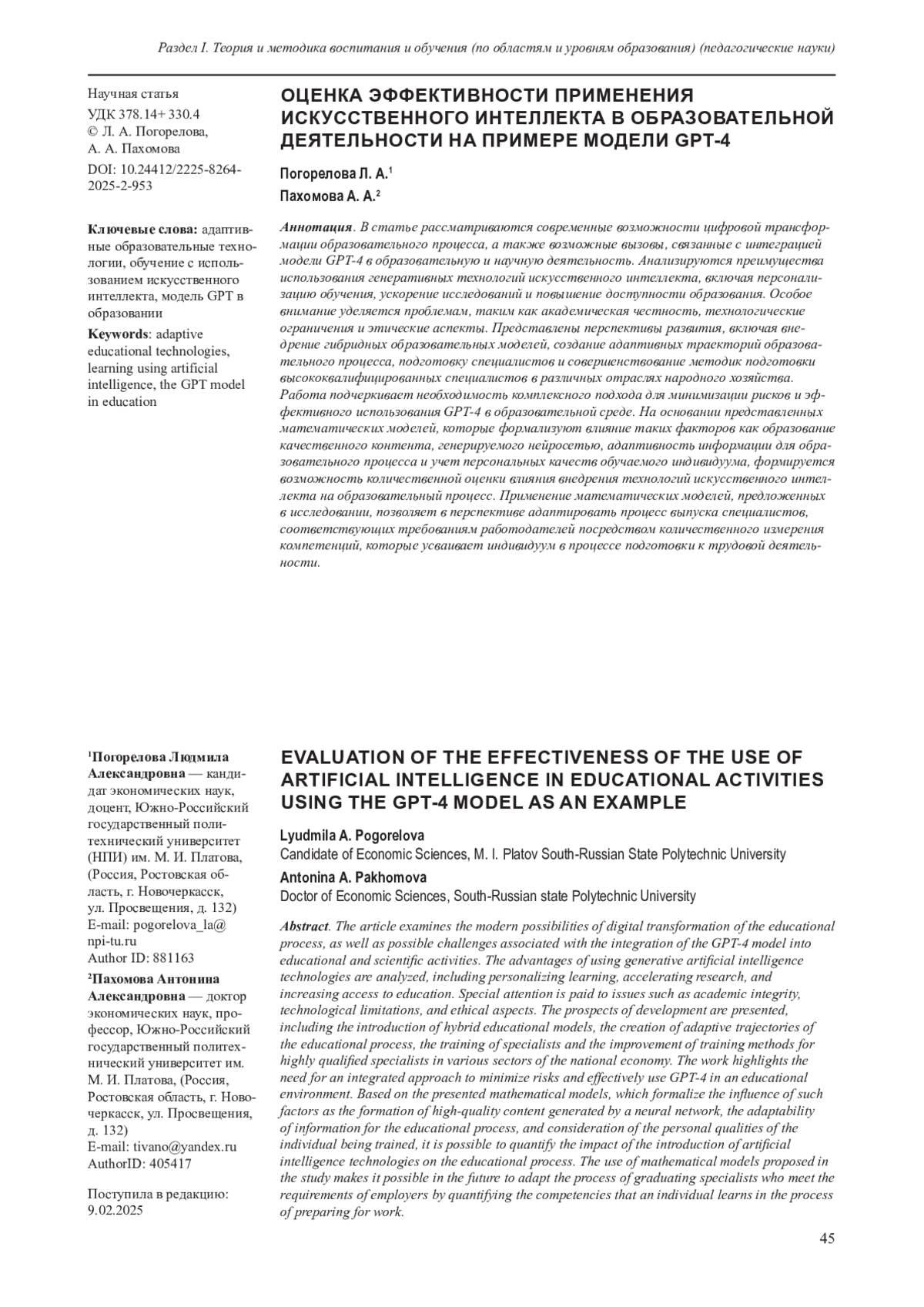 В статье рассматриваются современные возможности цифровой трансформации образовательного процесса, а также возможные вызовы, связанные с интеграцией модели GPT-4 в образовательную и научную деятельность. Анализируются преимущества использования генеративных технологий искусственного интеллекта, включая персонализацию обучения, ускорение исследований и повышение доступности образования. Особое внимание уделяется проблемам, таким как академическая честность, технологические ограничения и этические аспекты. Представлены перспективы развития, включая внедрение гибридных образовательных моделей, создание адаптивных траекторий образовательного процесса, подготовку специалистов и совершенствование методик подготовки высококвалифицированных специалистов в различных отраслях народного хозяйства. Работа подчеркивает необходимость комплексного подхода для минимизации рисков и эффективного использования GPT-4 в образовательной среде. На основании представленных математических моделей, которые формализуют влияние таких факторов как образование качественного контента, генерируемого нейросетью, адаптивность информации для образовательного процесса и учет персональных качеств обучаемого индивидуума, формируется возможность количественной оценки влияния внедрения технологий искусственного интеллекта на образовательный процесс. Применение математических моделей, предложенных в исследовании, позволяет в перспективе адаптировать процесс выпуска специалистов, соответствующих требованиям работодателей посредством количественного измерения компетенций, которые усваивает индивидуум в процессе подготовки к трудовой деятельности.