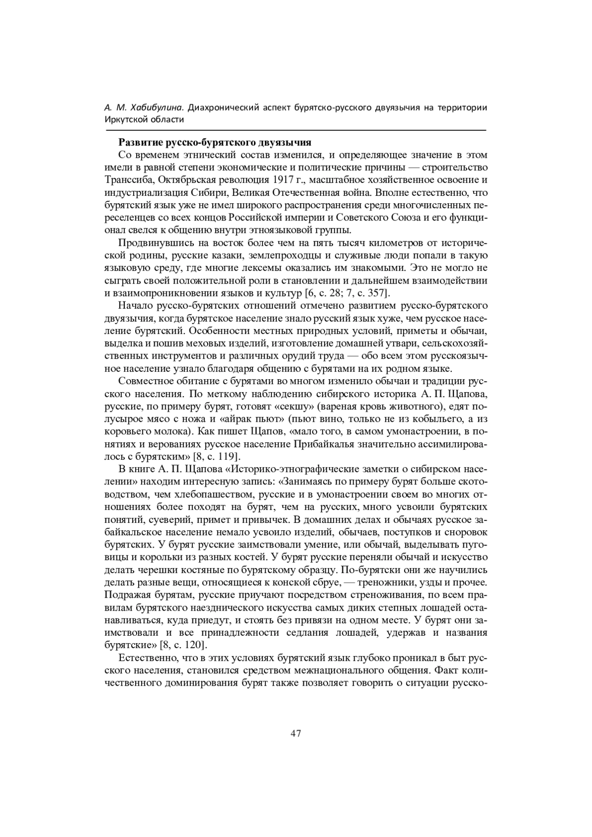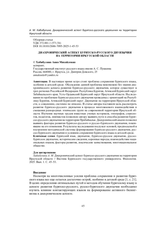 В настоящее время остро стоит проблема сохранения бурятского языка, особенно в детской среде. Обсуждение данной проблемы невозможно без знания диахронического аспекта развития бурятско-русского двуязычия, которое существует в трех регионах Российской Федерации: Республика Бурятия, Агинский Бурятский округ Забайкальского края, Усть-Ордынский Бурятский округ Иркутской области. Исследования по проблемам бурятско-русского двуязычия проведены с ориентаций на Республику Бурятия, Агинский Бурятский округ. Двуязычие на территории Иркутской области, к сожалению, системно не описано. В статье авторы поставили цель рассмотреть развитие бурятско-русского двуязычия в процессе многовекового взаимодействия и смешения разнородных этнических групп на современной территории Иркутской области. Изучение научных трудов известных ученых историков, этнографов, социологов, педагогов, лингвистов позволило автору выявить пути и способы развития бурятско-русского двуязычия на территории Прибайкалья. Диахронический анализ позволил выявить факторы развития бурятско-русского и русско-бурятского двуязычия, повлиявшие на его изменения. Результаты исследования послужат основой, предпосылкой в построении методической системы формирования бурятско-русского двуязычия, русско-бурятского двуязычия и условием сохранения бурятского языка в детской среде.