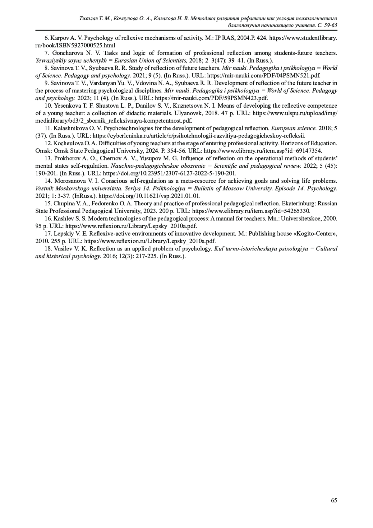 9. Савинова Т. В., Варданян Ю. В., Вдовина Н. А., Сюбаева Р. Р. Развитие рефлексии будущего педагога в процессе освоения психологических дисциплин // Мир науки. Педагогика и психология. 2023. Т. 11. № 4. URL: https://mir-nauki.com/PDF/59PSMN423.pdf