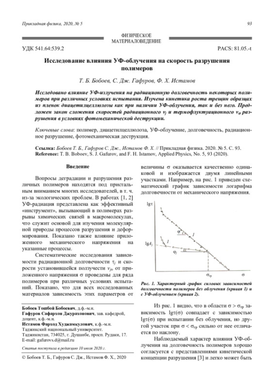 Бобоев Т. Б., Гафуров С. Дж., Истамов Ф. Х. Исследование влияния УФ-облучения на скорость разрушения полимеров 93