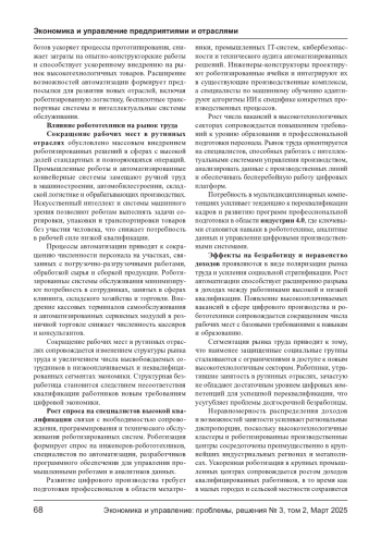 Развитие технологий, автоматизации и роботизации коренным образом трансформирует рыночный труд, изменяя структуру потребностей и потребности в квалификации специалистов. Внедрение искусственного интеллекта, машинного обучения и роботизированных систем снижает потребность в рутинном труде, но постоянно создает новые рабочие места в высокотехнологичных секторах. Экономический анализ последствий эволюции проявляется как эффект преобразования, связанный с вытеснением рабочих мест, а также дополняющий эффект, способствующий росту производительности и созданию новых профессий. В статье рассматриваются эмпирические факторы влияния автоматизации на уровень безопасности, анализируются социальные и международные данные этого процесса, а также обсуждаются меры государственной политики, направленные на адаптацию рынка труда. Особое внимание уделяется долгосрочным тенденциям автоматизации и возможному будущему бездействию в условиях технологического прогресса.