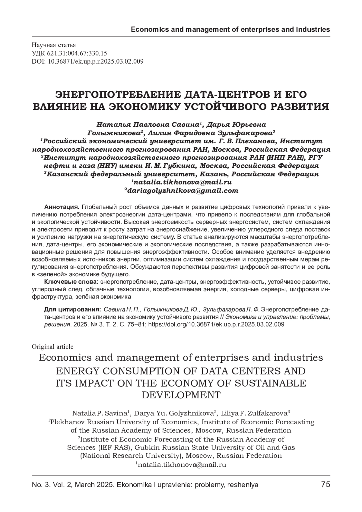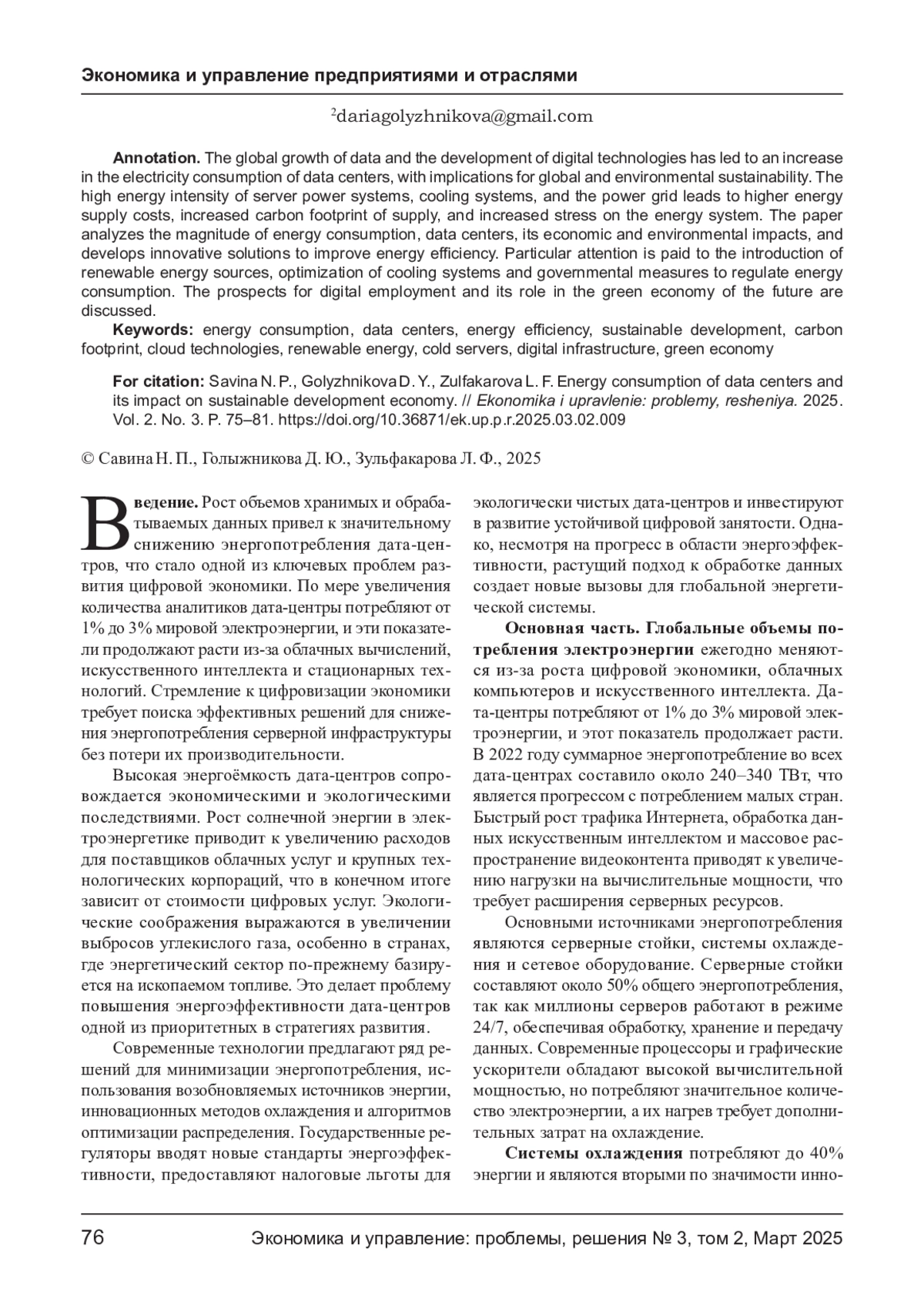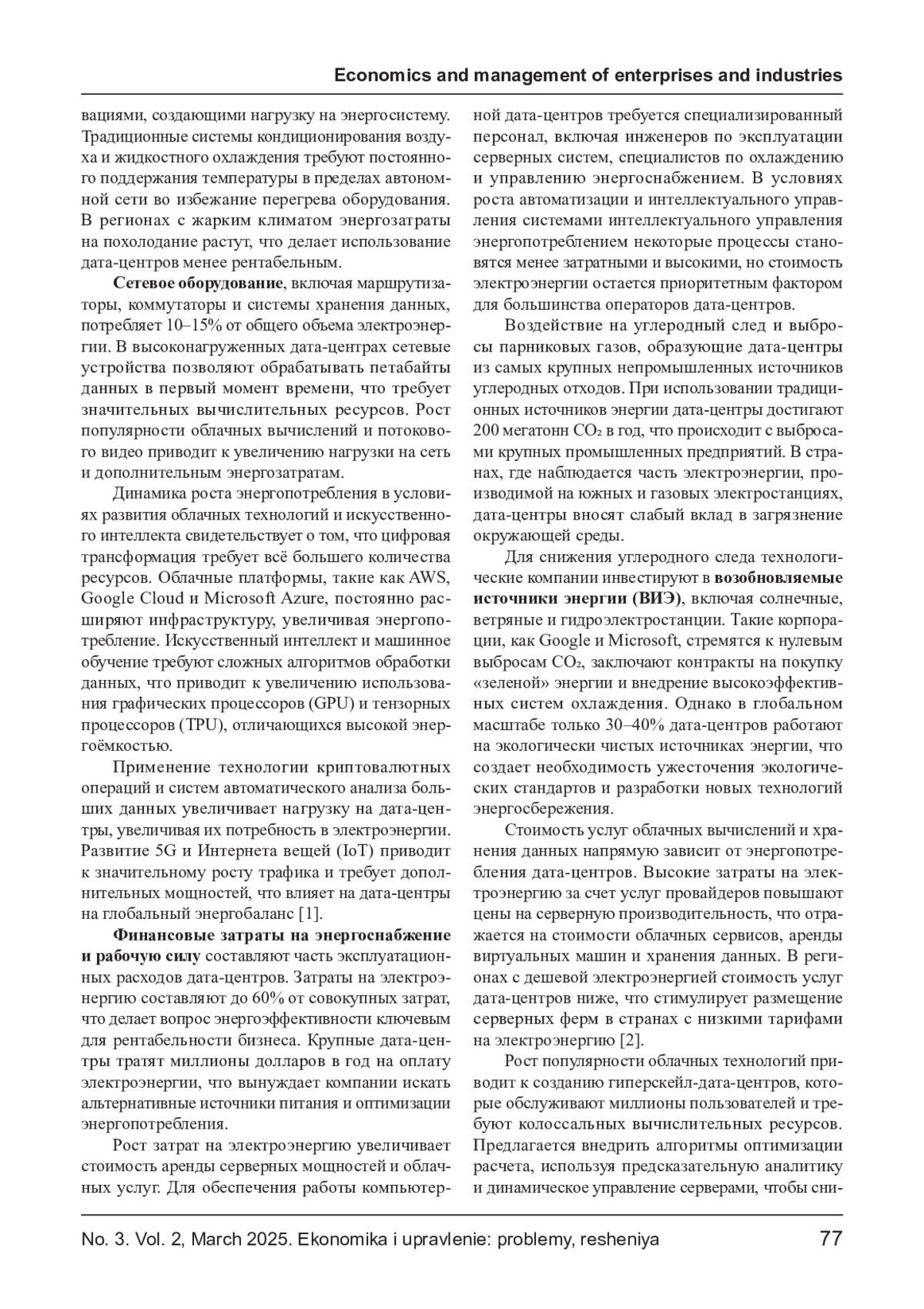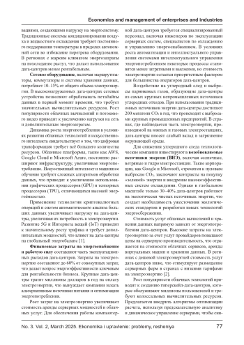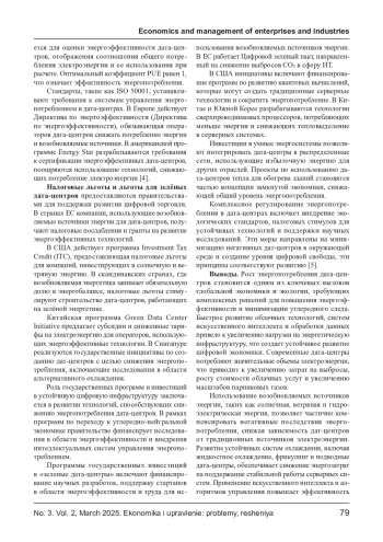 Глобальный рост объемов данных и развитие цифровых технологий привели к увеличению потребления электроэнергии дата-центрами, что привело к последствиям для глобальной и экологической устойчивости. Высокая энергоемкость серверных энергосистем, систем охлаждения и электросети приводит к росту затрат на энергоснабжение, увеличению углеродного следа поставок и усилению нагрузки на энергетическую систему. В статье анализируются масштабы энергопотребления, дата-центры, его экономические и экологические последствия, а также разрабатываются инновационные решения для повышения энергоэффективности. Особое внимание уделяется внедрению возобновляемых источников энергии, оптимизации систем охлаждения и государственным мерам регулирования энергопотребления. Обсуждаются перспективы развития цифровой занятости и ее роль в «зеленой» экономике будущего.