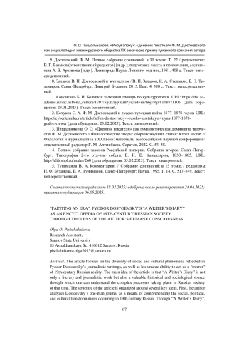 ПИЩАЛЬНИКОВА О. О. «РИСУЯ ЭПОХУ»: «ДНЕВНИК ПИСАТЕЛЯ» Ф. М. ДОСТОЕВСКОГО КАК ЭНЦИКЛОПЕДИЯ ЖИЗНИ РУССКОГО ОБЩЕСТВА XIX ВЕКА ЧЕРЕЗ ПРИЗМУ ГУМАННОГО СОЗНАНИЯ АВТОРА // ВЕСТНИК БУРЯТСКОГО ГОСУДАРСТВЕННОГО УНИВЕРСИТЕТА. ФИЛОЛОГИЯ. 2025. № 2