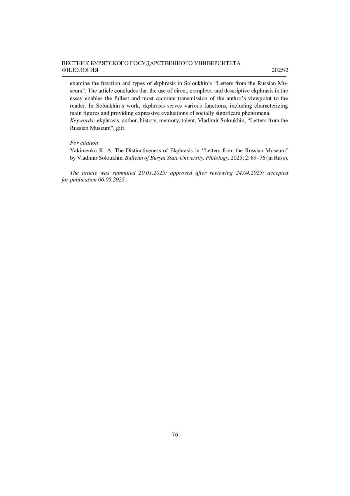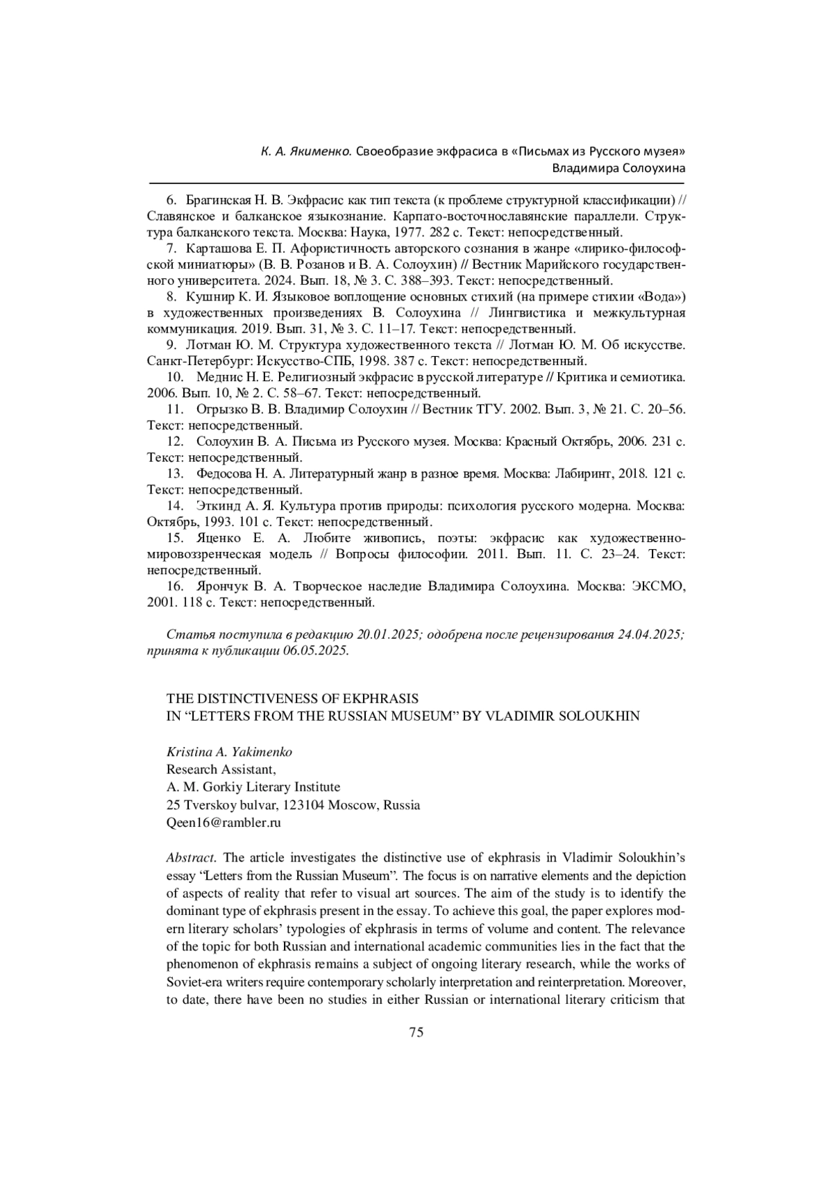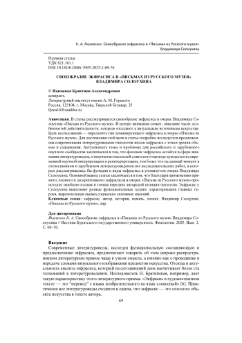 В статье рассматривается своеобразие экфрасиса в очерке Владимира Солоухина «Письма из Русского музея». В центре внимания сюжет, описание таких особенностей действительности, которые отсылают к визуальным источникам искусства. Цель исследования - определить тип доминирующего экфрасиса в очерке «Письма из Русского музея». Для достижения этой цели в статье подробно исследуется предложенная современными литературоведами типология видов экфрасиса с точки зрения объема и содержания. Актуальность темы и проблемы для российского и зарубежного научного сообщества заключается в том, что феномен экфрасиса остаётся в сфере внимания литературоведов, а творчество писателей советского периода нуждается в современной научной интерпретации и реинтерпретации, тем более что на данный момент в отечественном и зарубежном литературоведении нет исследовательских работ, в которых рассматривались бы функция и виды экфрасиса в упомянутом очерке Владимира Солоухина. Основной вывод статьи заключается в том, что благодаря применению прямого, полного и дескриптивного экфрасисов в очерке «Письма из Русского музея» происходит наиболее полная и точная передача авторской позиции читателю. Экфрасис у Солоухина выполняет разные функциональные задачи: характеризация главных героев, выразительная оценка социально значимых явлений