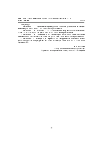В докладе В. В. Башкеевой о научном портрете юбиляра были выделены три этапа в становлении исследователя, ученого С. С. Имихеловой: 80-е годы — изучение советской, в том числе бурятской советской драматургии, 90-е годы ХХ в. — проблема автора в русской советской литературе, 10–20-е годы XXI в. — параллельная работа над бурятской и русской темами в аспекте изучения прежде всего — в широком смысле слова — романтических литературных тенденций. Основной научный интерес в области драматургии был связан с изучением советской семейно-бытовой, или психологической, драмы (А. Арбузов, М. Рощин, А. Соколова, В. Розов, А. Вампилов) [1]. В акцентировании семейно-бытовой драмы как психологической драмы заметно стремление перейти от тематического обозначения жанра к эстетическому анализу.