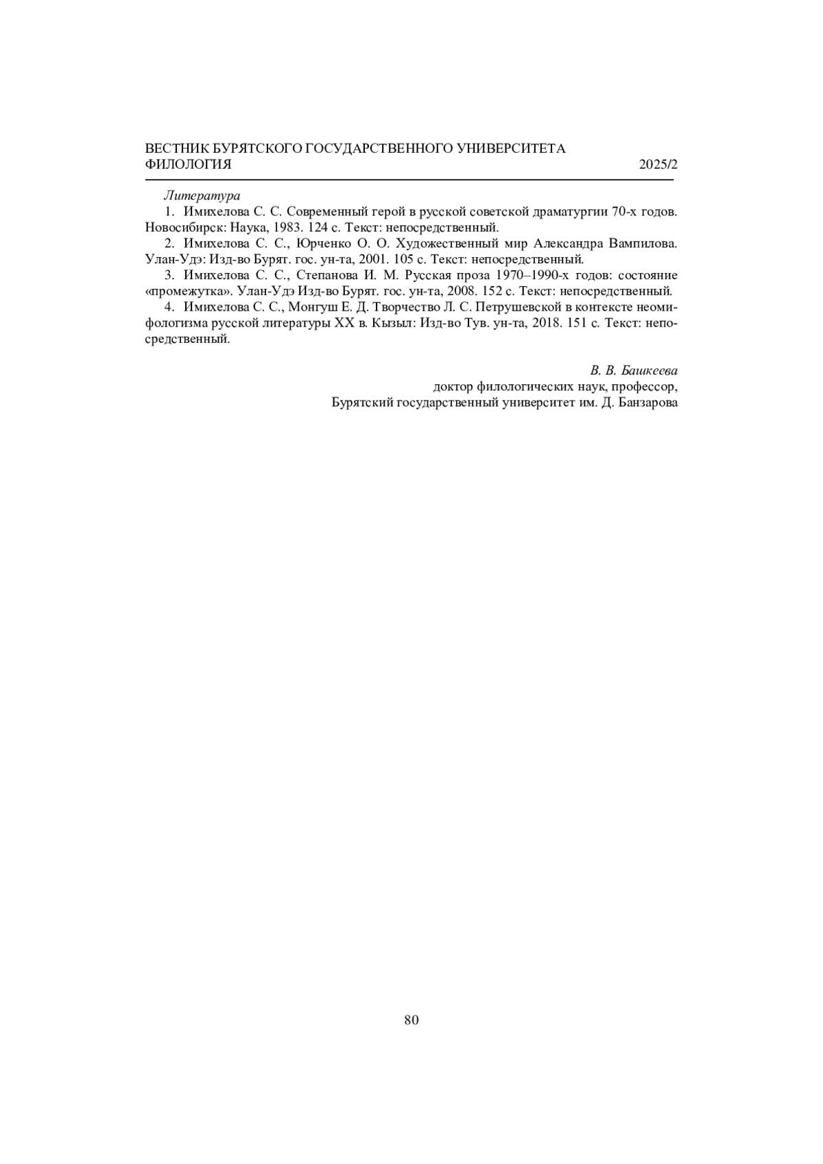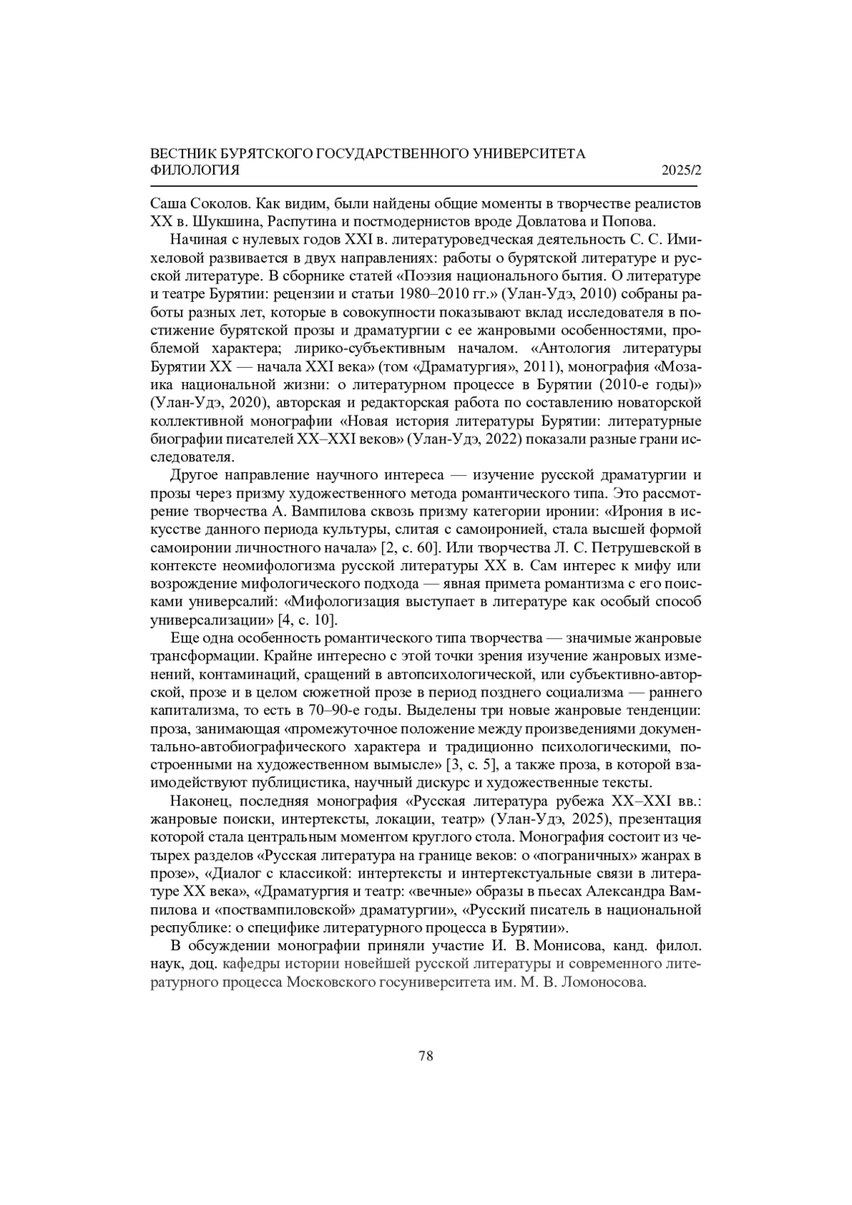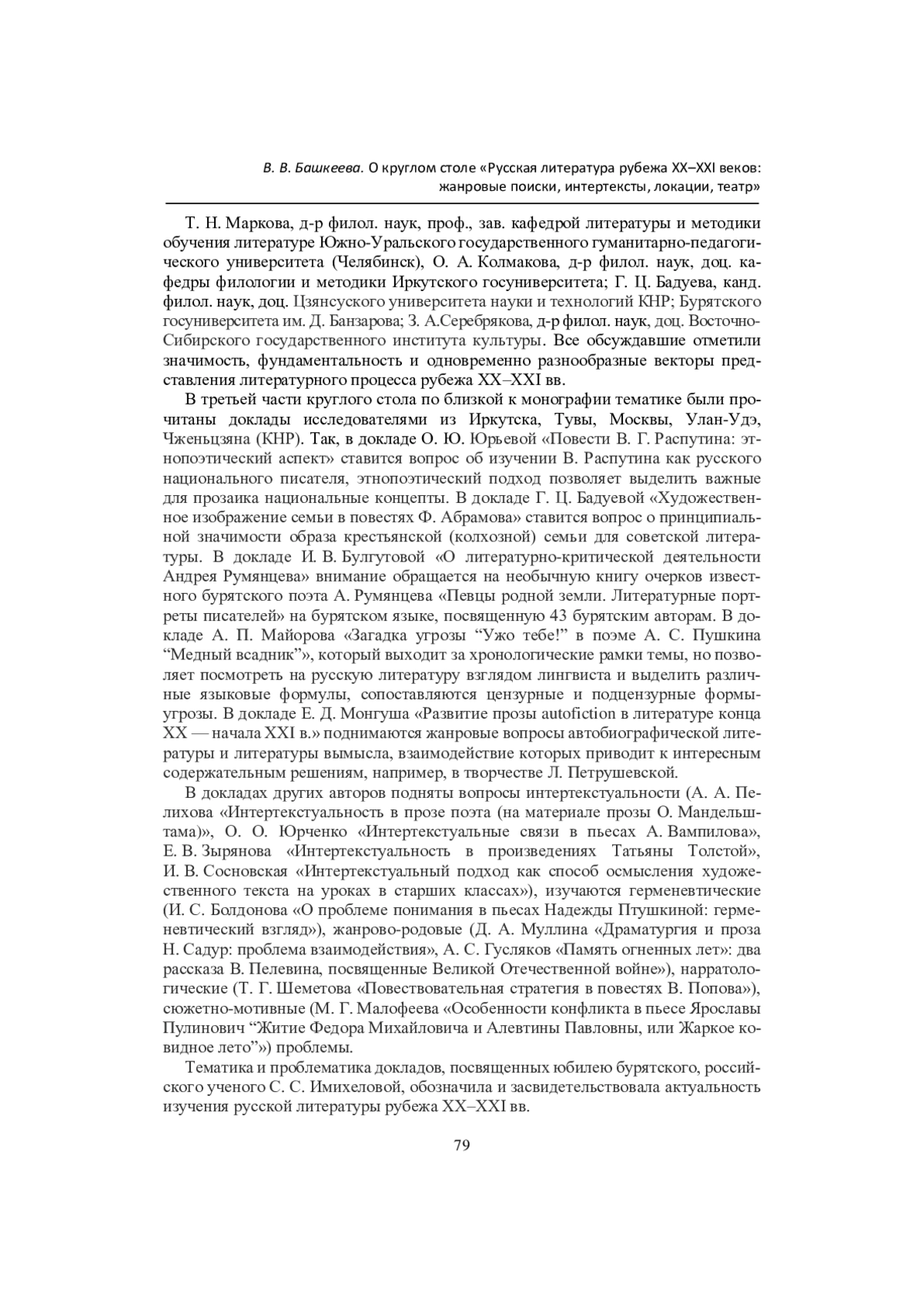 БАШКЕЕВА В. В. О КРУГЛОМ СТОЛЕ «РУССКАЯ ЛИТЕРАТУРА РУБЕЖА ХХ-ХХ1 ВЕКОВ: ЖАНРОВЫЕ ПОИСКИ, ИНТЕРТЕКСТЫ, ЛОКАЦИИ, ТЕАТР» // ВЕСТНИК БУРЯТСКОГО ГОСУДАРСТВЕННОГО УНИВЕРСИТЕТА. ФИЛОЛОГИЯ. 2025. № 2