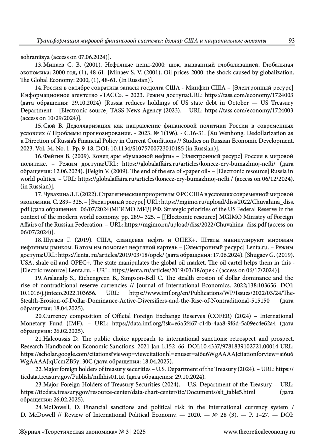 24. McDowell, D. Financial sanctions and political risk in the international currency system / D. McDowell // Review of International Political Economy. - 2020. - № 28 (3). - P. 1-27. - URL: https://www.sci-hub.ru/ (дата обращения: 18.04.2025). DOI: 10.1080/09692290.2020.1736126 EDN: HJEGOQ