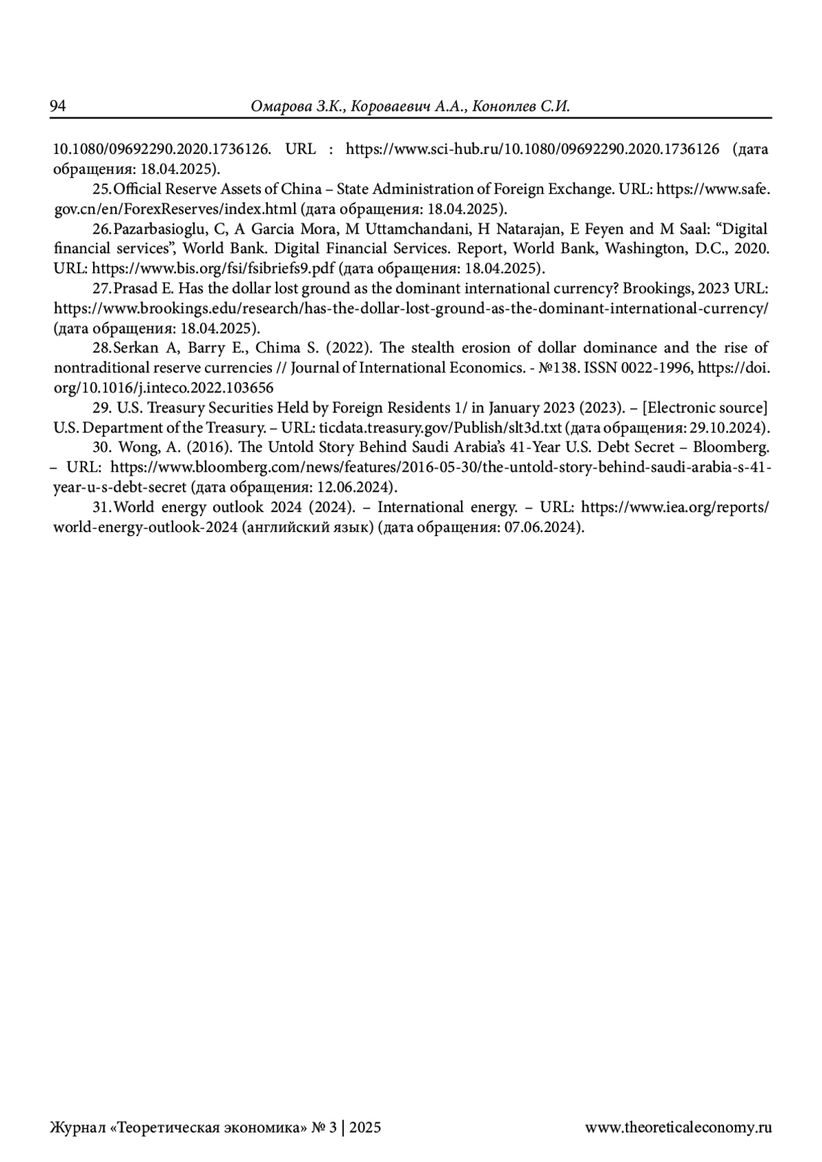 28. Serkan A, Barry E., Chima S. (2022). The stealth erosion of dollar dominance and the rise of nontraditional reserve currencies // Journal of International Economics. - №138. ISSN 0022-1996,. DOI: 10.1016/j.inteco.2022.103656