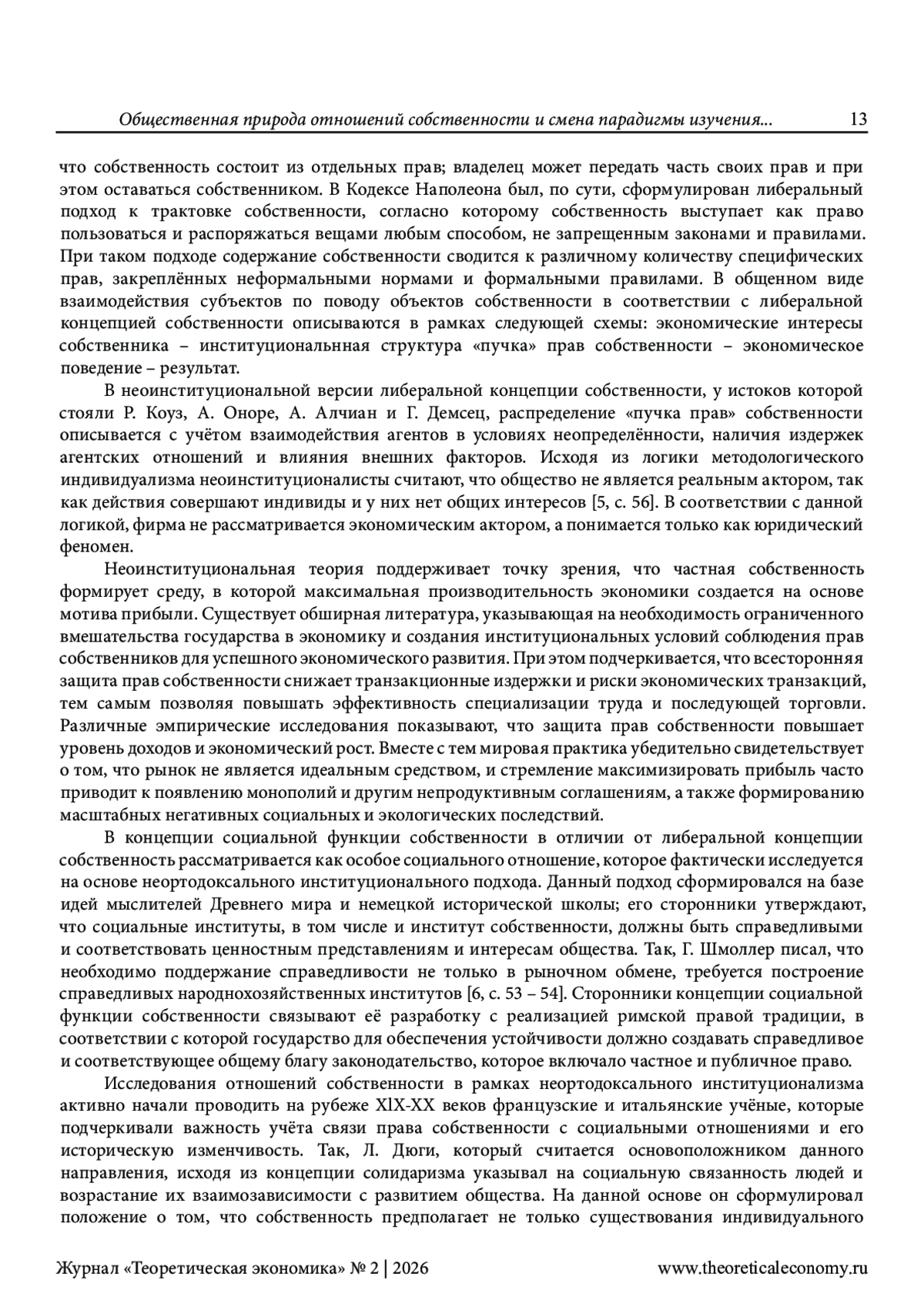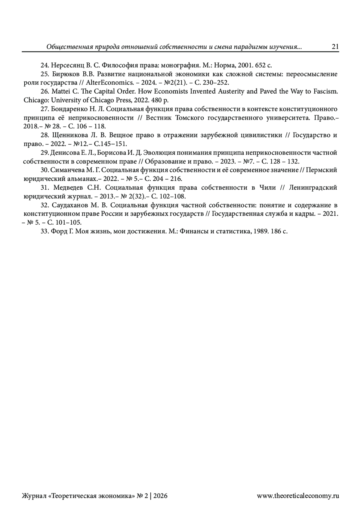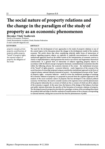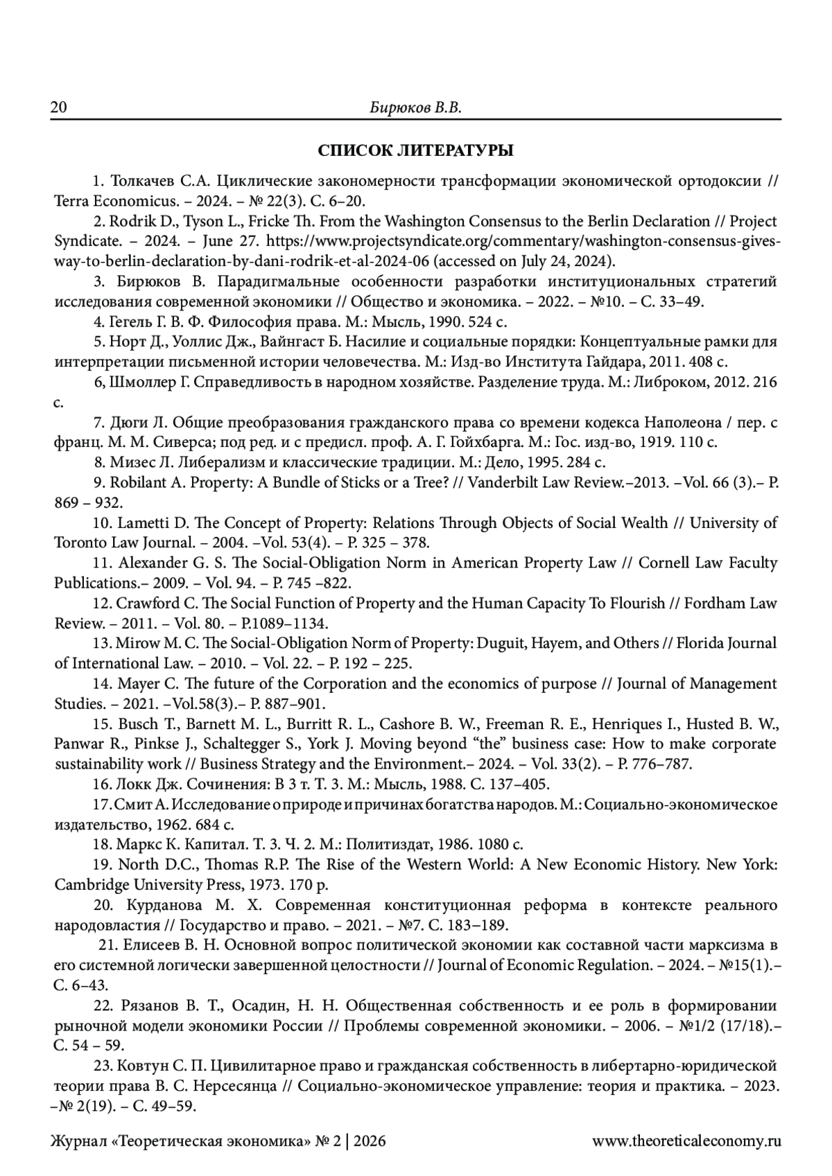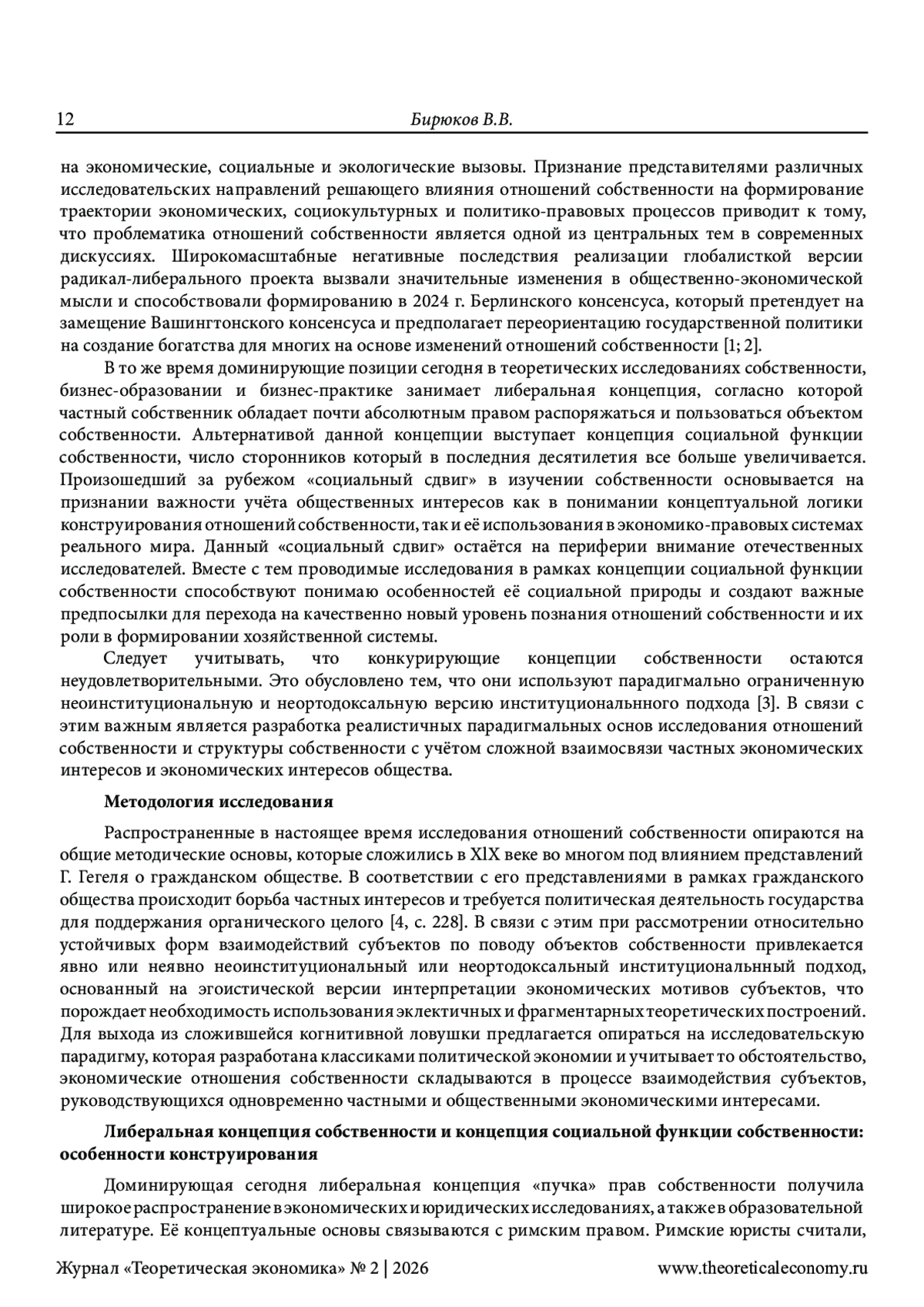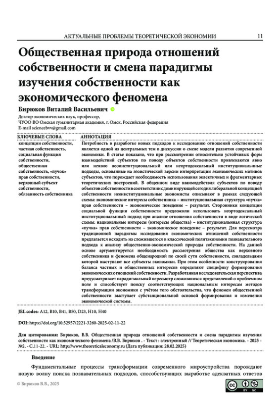 БИРЮКОВ В. В. ОБЩЕСТВЕННАЯ ПРИРОДА ОТНОШЕНИЙ СОБСТВЕННОСТИ И СМЕНА ПАРАДИГМЫ ИЗУЧЕНИЯ СОБСТВЕННОСТИ КАК ЭКОНОМИЧЕСКОГО ФЕНОМЕНА // ТЕОРЕТИЧЕСКАЯ ЭКОНОМИКА. 2025. № 2 (122)