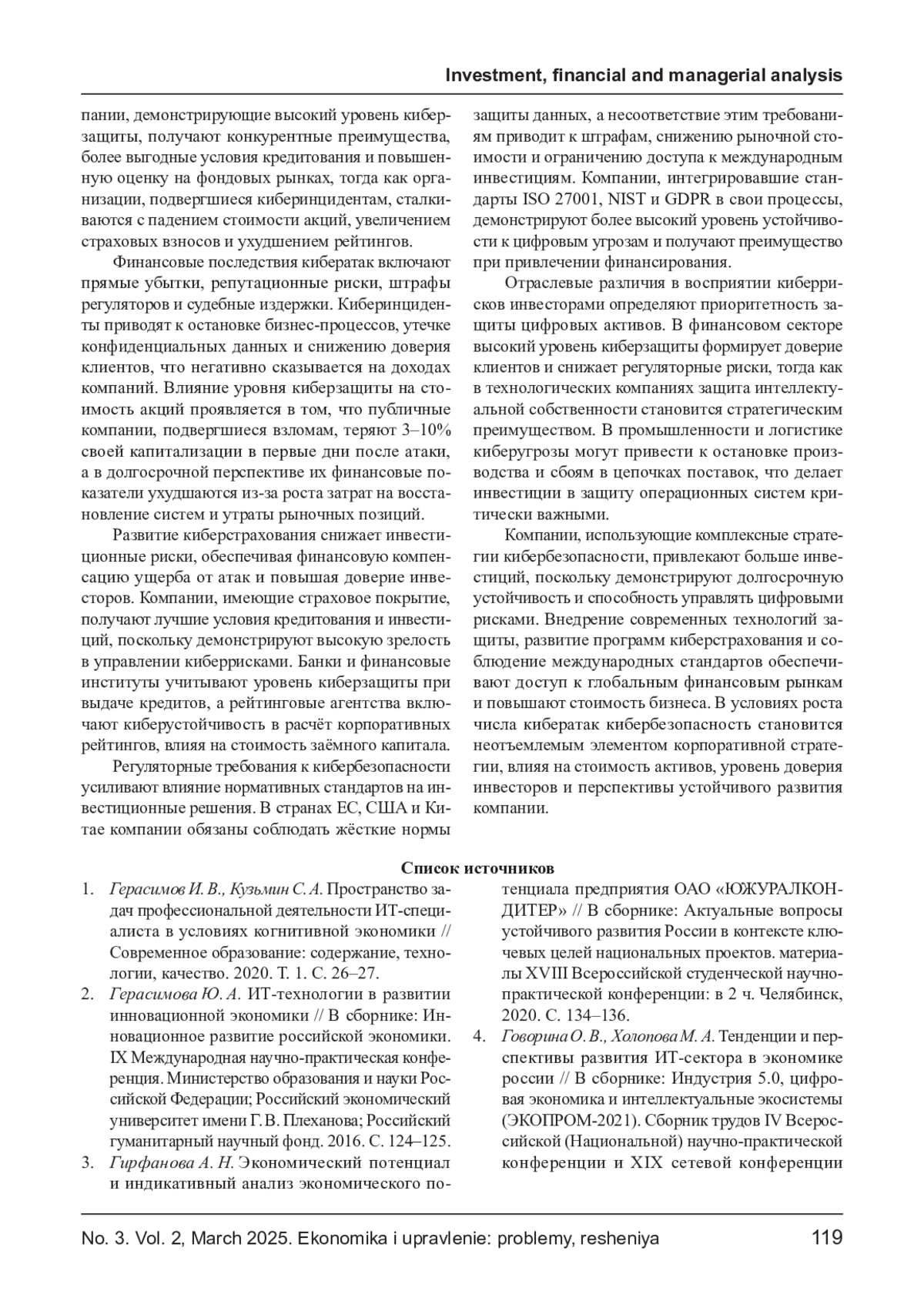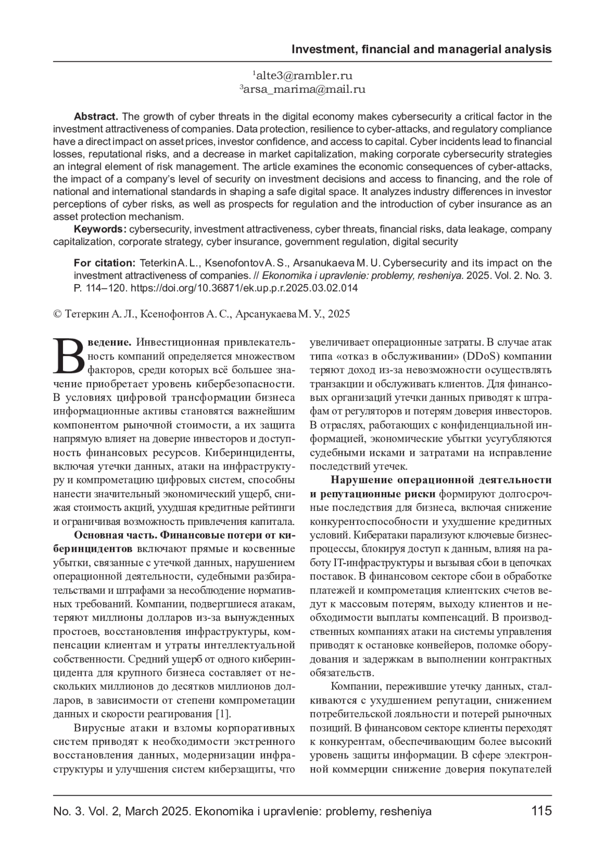 ТЕТЕРКИН А. Л., КСЕНОФОНТОВ А. С., АРСАНУКАЕВА М. У. КИБЕРБЕЗОПАСНОСТЬ И ЕЕ ВЛИЯНИЕ НА ИНВЕСТИЦИОННУЮ ПРИВЛЕКАТЕЛЬНОСТЬ КОМПАНИЙ // ЭКОНОМИКА И УПРАВЛЕНИЕ: ПРОБЛЕМЫ, РЕШЕНИЯ. 2025. ТОМ 2 № 3