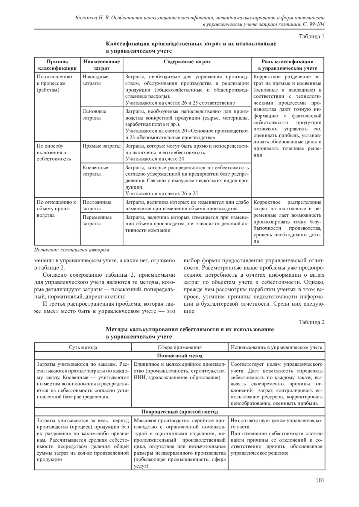 На сегодняшний день управленческий учет приобретает все большую значимость в деятельности предприятий. И такой повышенный интерес обусловлен закономерным развитием современного общества, влиянием таких факторов, как высокий уровень конкуренции на рынке, непредсказуемость инфляционных движений, значительный рост производственных затрат и т. д. В таких условиях одного бухгалтерского учета для принятия управленческих решений недостаточно, так как он не дает релевантной информации руководству компании для принятия обоснованных и эффективных решений по поводу хозяйственной деятельности. Это происходит, прежде всего, в связи с разными целями бухгалтерского и управленческого учета. Если цель первого — это минимизация налогооблагаемой базы, что допускает ситуацию, когда учитывается больше расходов, чем есть на самом деле. То главная цель управленческого учета состоит в предоставлении точной информации для принятия оперативных управленческих решений. В статье проанализированы и обобщены особенности использования в управленческом учете различных классификаций затрат, методов калькулирования себестоимости, форм управленческой отчетности. Выявлены наиболее и наименее эффективные из них с точки зрения глубины информации и возможности на ее основе принятия управленческих решений.