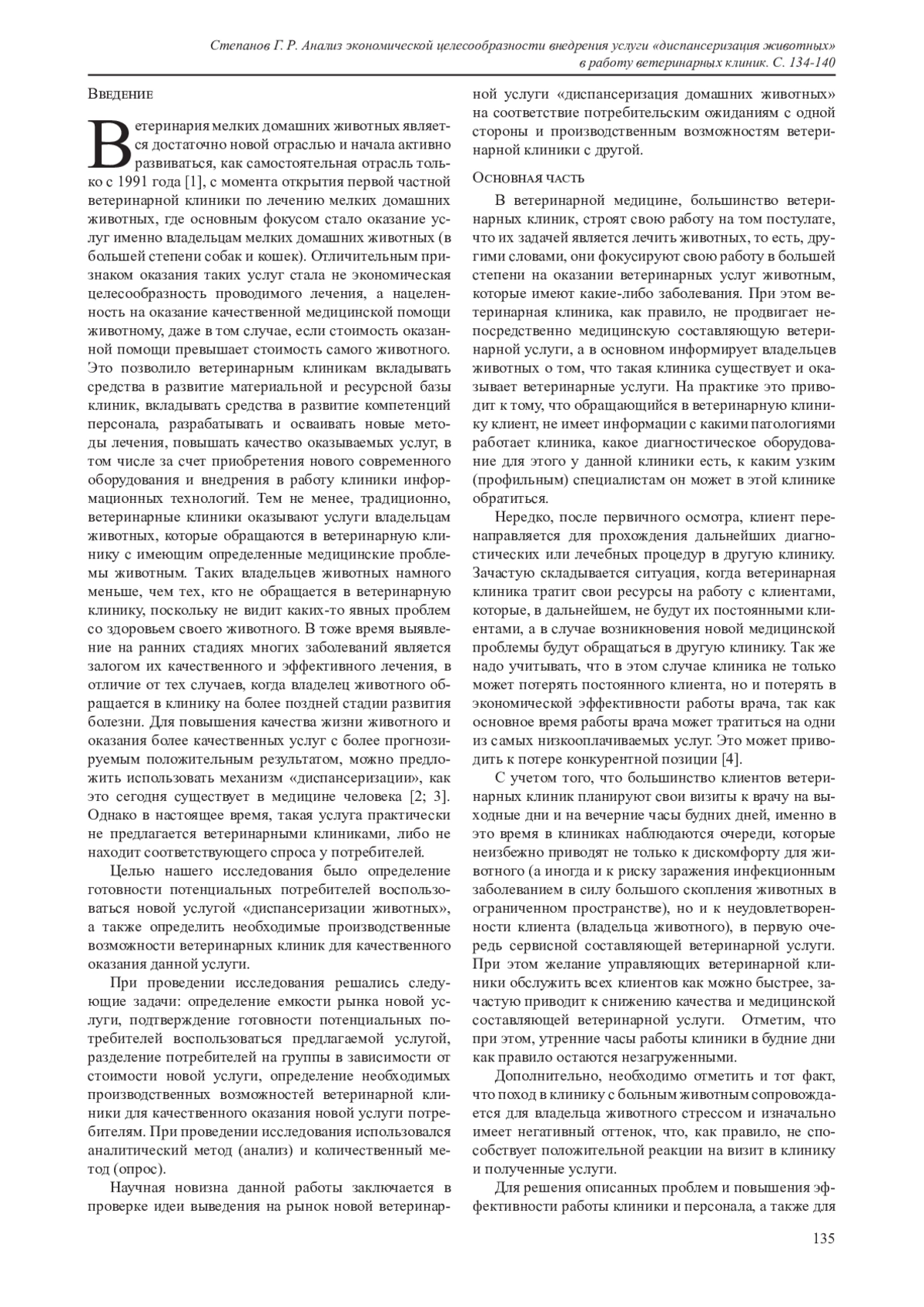 Статья: АНАЛИЗ ЭКОНОМИЧЕСКОЙ ЦЕЛЕСООБРАЗНОСТИ ВНЕДРЕНИЯ УСЛУГИ «ДИСПАНСЕРИЗАЦИЯ ЖИВОТНЫХ» В РАБОТУ ВЕТЕРИНАРНЫХ КЛИНИК (2025)