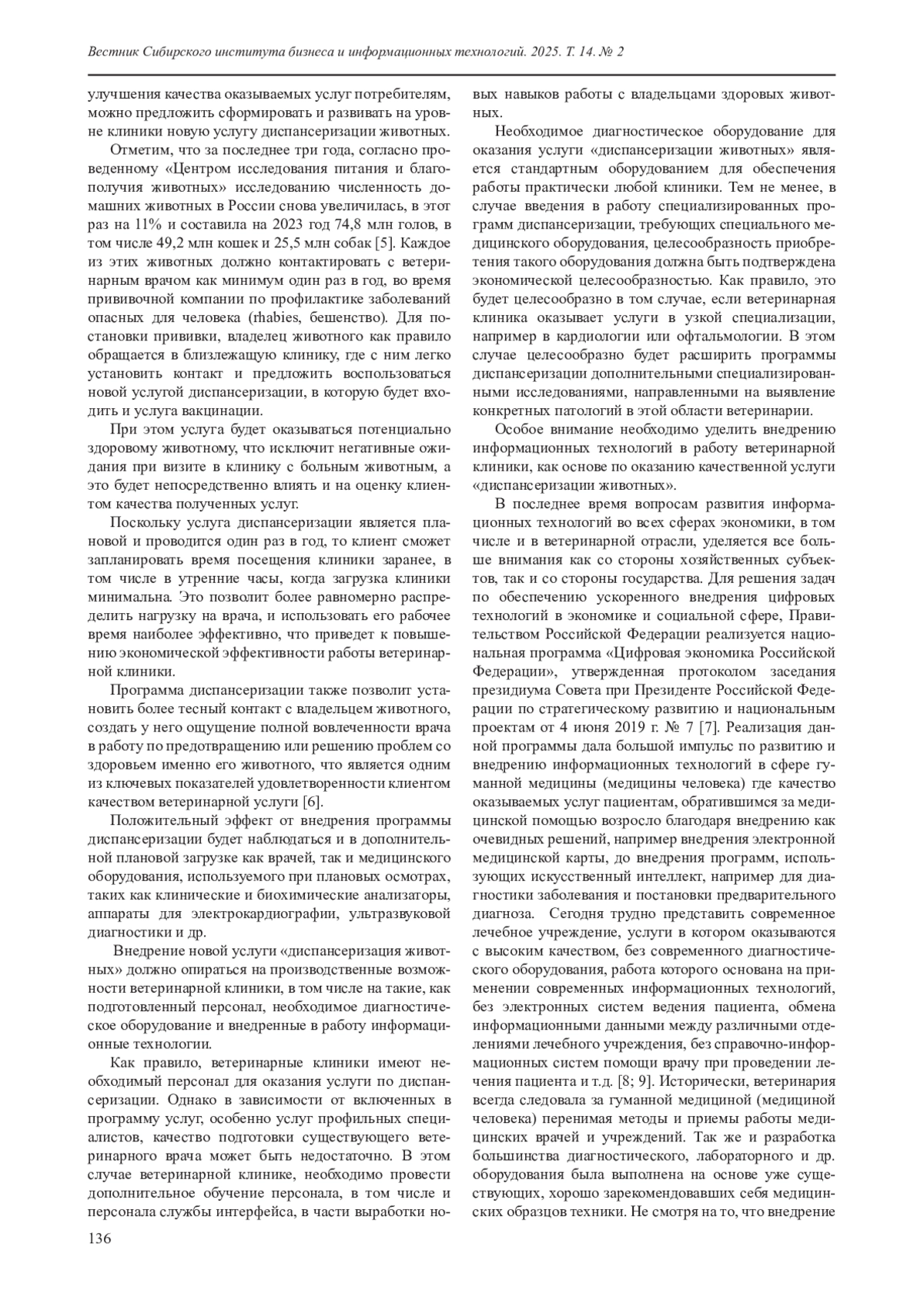 СТЕПАНОВ Г. Р. АНАЛИЗ ЭКОНОМИЧЕСКОЙ ЦЕЛЕСООБРАЗНОСТИ ВНЕДРЕНИЯ УСЛУГИ «ДИСПАНСЕРИЗАЦИЯ ЖИВОТНЫХ» В РАБОТУ ВЕТЕРИНАРНЫХ КЛИНИК // ВЕСТНИК СИБИРСКОГО ИНСТИТУТА БИЗНЕСА И ИНФОРМАЦИОННЫХ ТЕХНОЛОГИЙ. 2025. ТОМ 14, № 2
