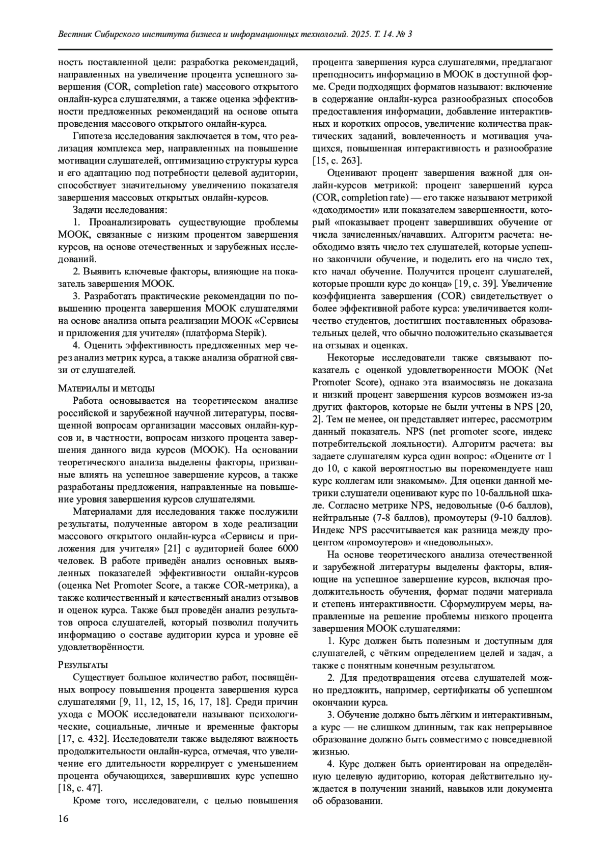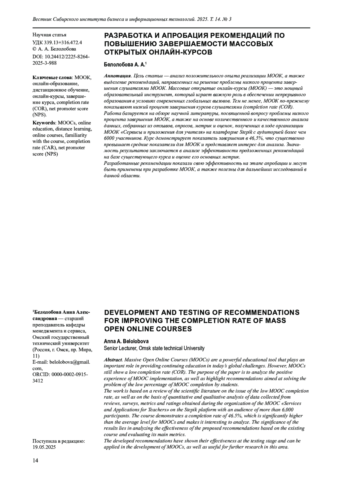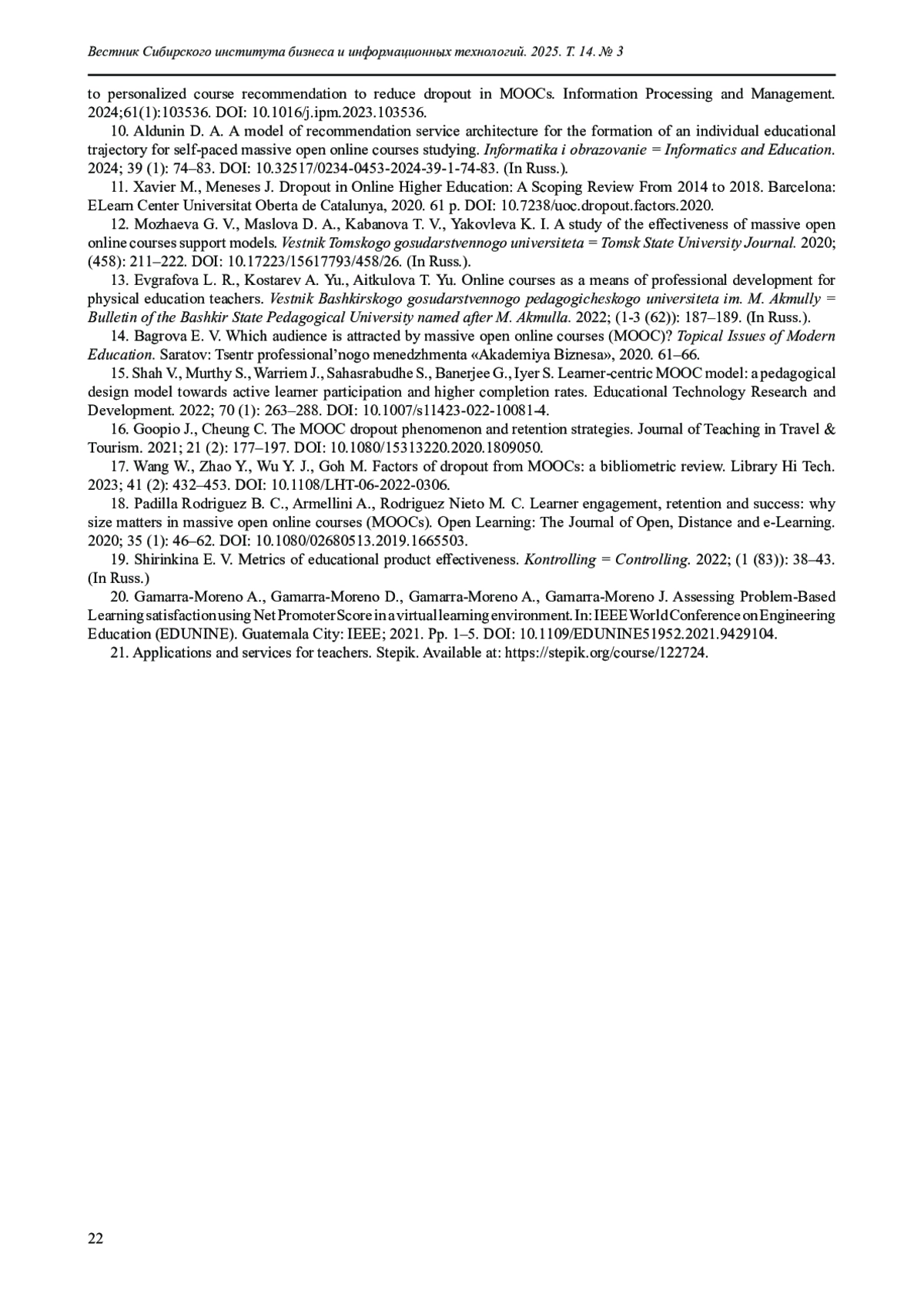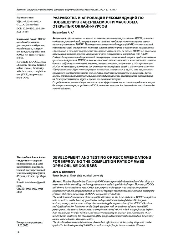 БЕЛОЛОБОВА А. А. РАЗРАБОТКА И АПРОБАЦИЯ РЕКОМЕНДАЦИЙ ПО ПОВЫШЕНИЮ ЗАВЕРШАЕМОСТИ МАССОВЫХ ОТКРЫТЫХ ОНЛАЙН-КУРСОВ // ВЕСТНИК СИБИРСКОГО ИНСТИТУТА БИЗНЕСА И ИНФОРМАЦИОННЫХ ТЕХНОЛОГИЙ. 2025. ТОМ 14, № 3