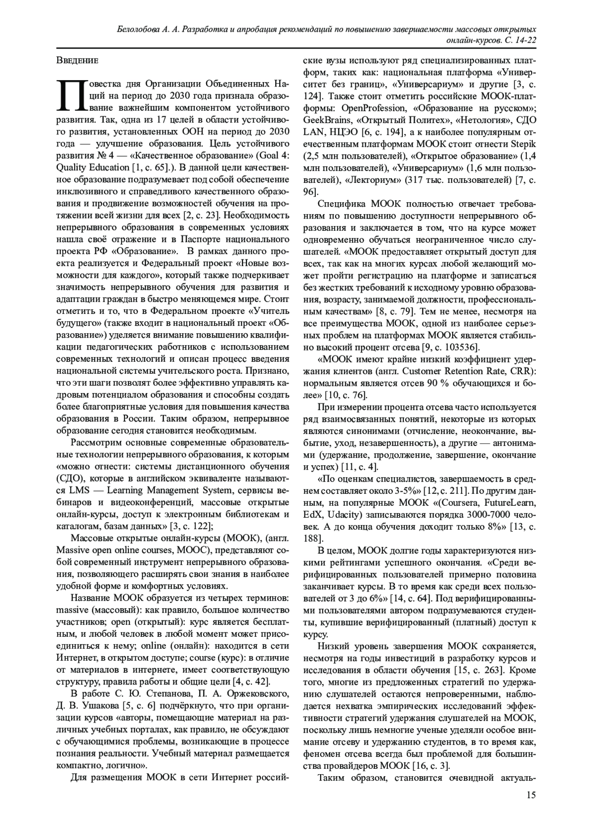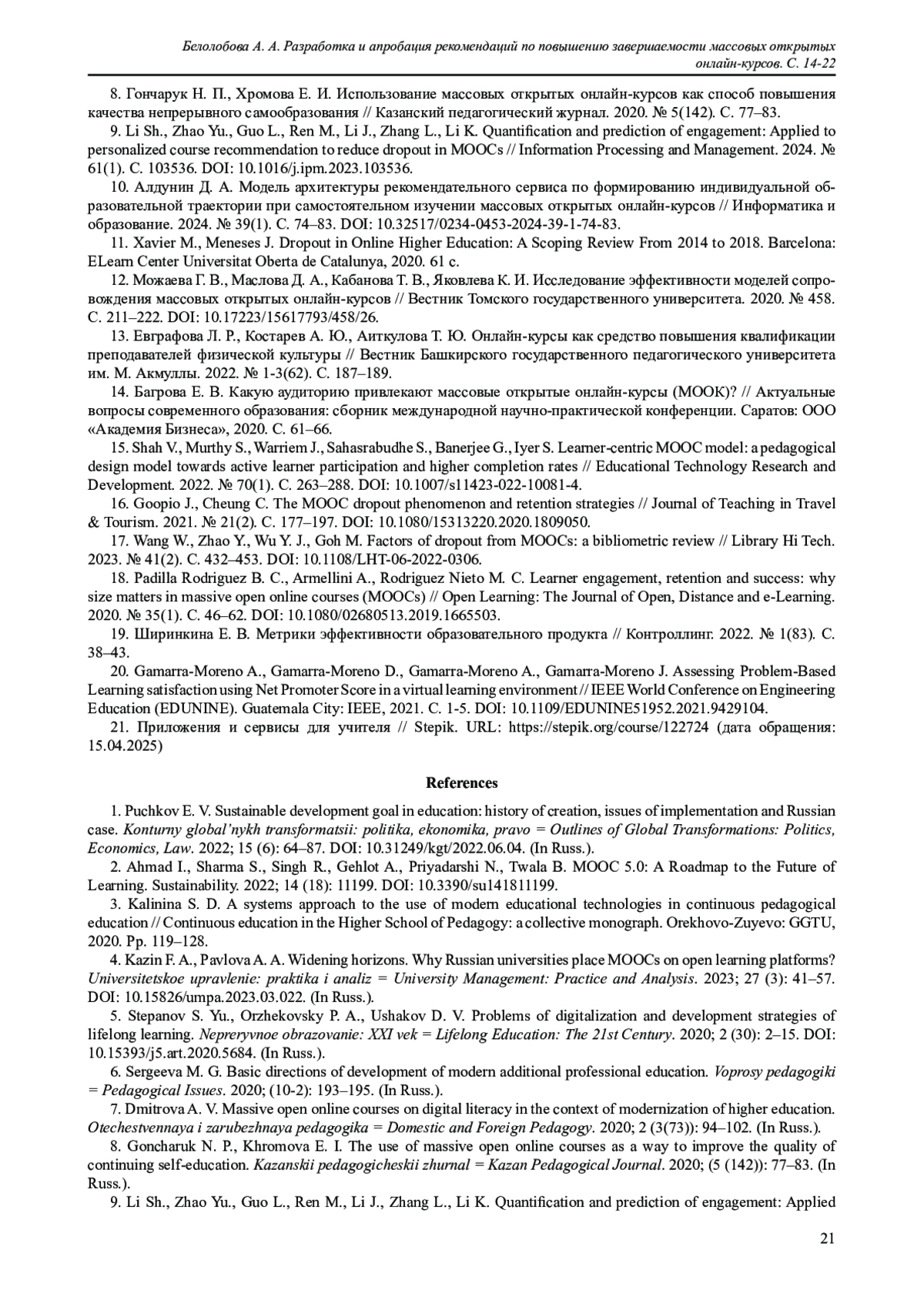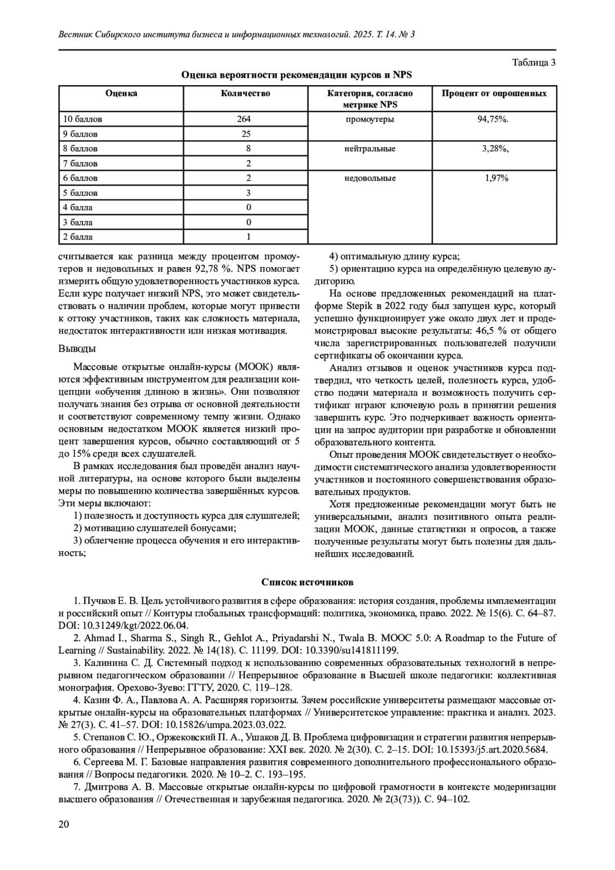 БЕЛОЛОБОВА А. А. РАЗРАБОТКА И АПРОБАЦИЯ РЕКОМЕНДАЦИЙ ПО ПОВЫШЕНИЮ ЗАВЕРШАЕМОСТИ МАССОВЫХ ОТКРЫТЫХ ОНЛАЙН-КУРСОВ // ВЕСТНИК СИБИРСКОГО ИНСТИТУТА БИЗНЕСА И ИНФОРМАЦИОННЫХ ТЕХНОЛОГИЙ. 2025. ТОМ 14, № 3