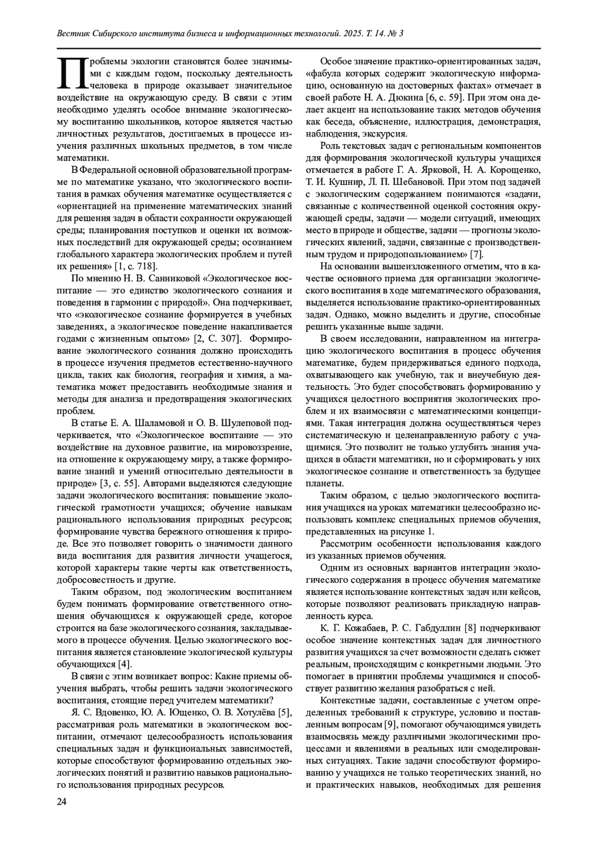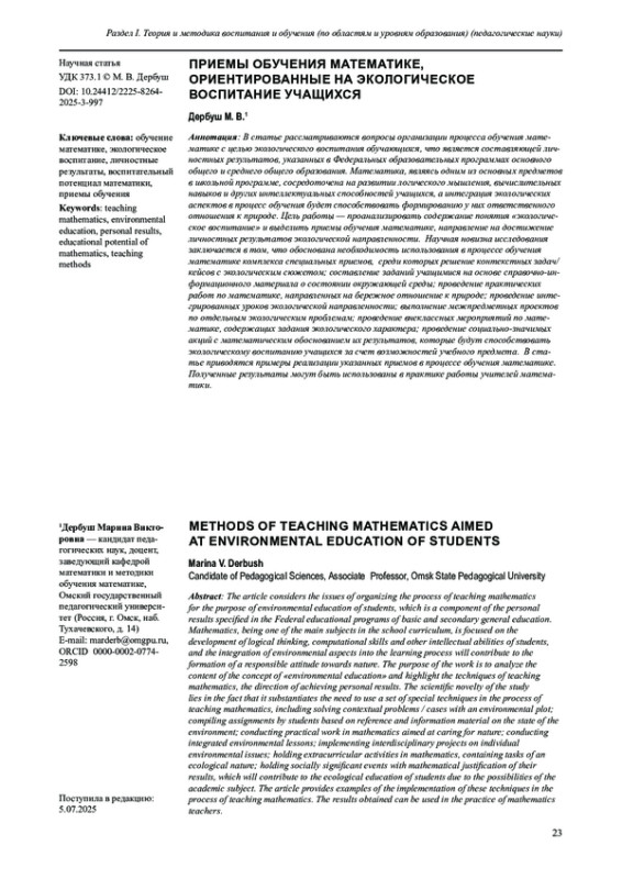 В статье рассматриваются вопросы организации процесса обучения математике с целью экологического воспитания обучающихся, что является составляющей личностных результатов, указанных в Федеральных образовательных программах основного общего и среднего общего образования. Математика, являясь одним из основных предметов в школьной программе, сосредоточена на развитии логического мышления, вычислительных навыков и других интеллектуальных способностей учащихся, а интеграция экологических аспектов в процесс обучения будет способствовать формированию у них ответственного отношения к природе. Цель работы — проанализировать содержание понятия «экологическое воспитание» и выделить приемы обучения математике, направление на достижение личностных результатов экологической направленности. Научная новизна исследования заключается в том, что обоснована необходимость использования в процессе обучения математике комплекса специальных приемов, среди которых решение контекстных задач/кейсов с экологическим сюжетом; составление заданий учащимися на основе справочно-информационного материала о состоянии окружающей среды; проведение практических работ по математике, направленных на бережное отношение к природе; проведение интегрированных уроков экологической направленности; выполнение межпредметных проектов по отдельным экологическим проблемам; проведение внеклассных мероприятий по математике, содержащих задания экологического характера; проведение социально-значимых акций с математическим обоснованием их результатов, которые будут способствовать экологическому воспитанию учащихся за счет возможностей учебного предмета. В статье приводятся примеры реализации указанных приемов в процессе обучения математике. Полученные результаты могут быть использованы в практике работы учителей математики.