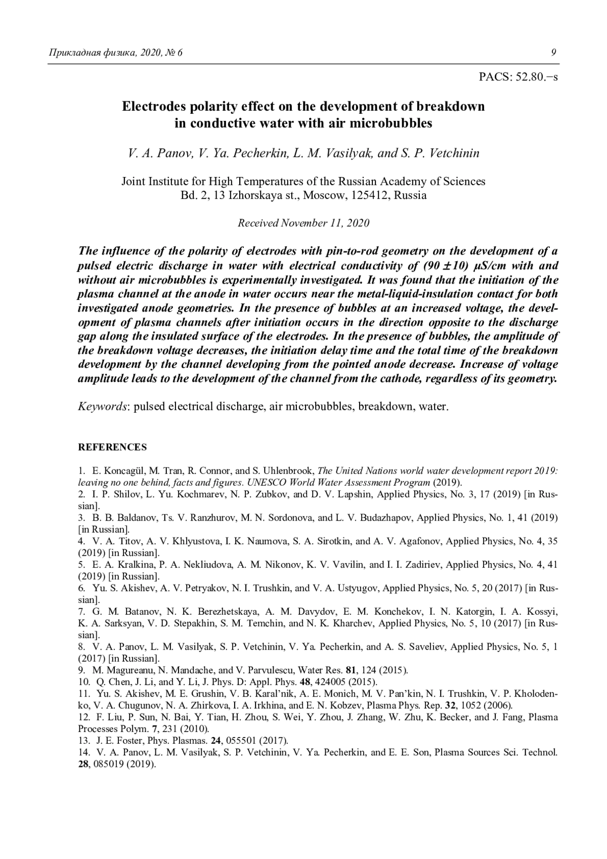 8. Панов В. А., Василяк Л. М., Ветчинин С. П., Печеркин В. Я., Савельев А. С. // Прикладная физика. 2017. № 5. С. 1.