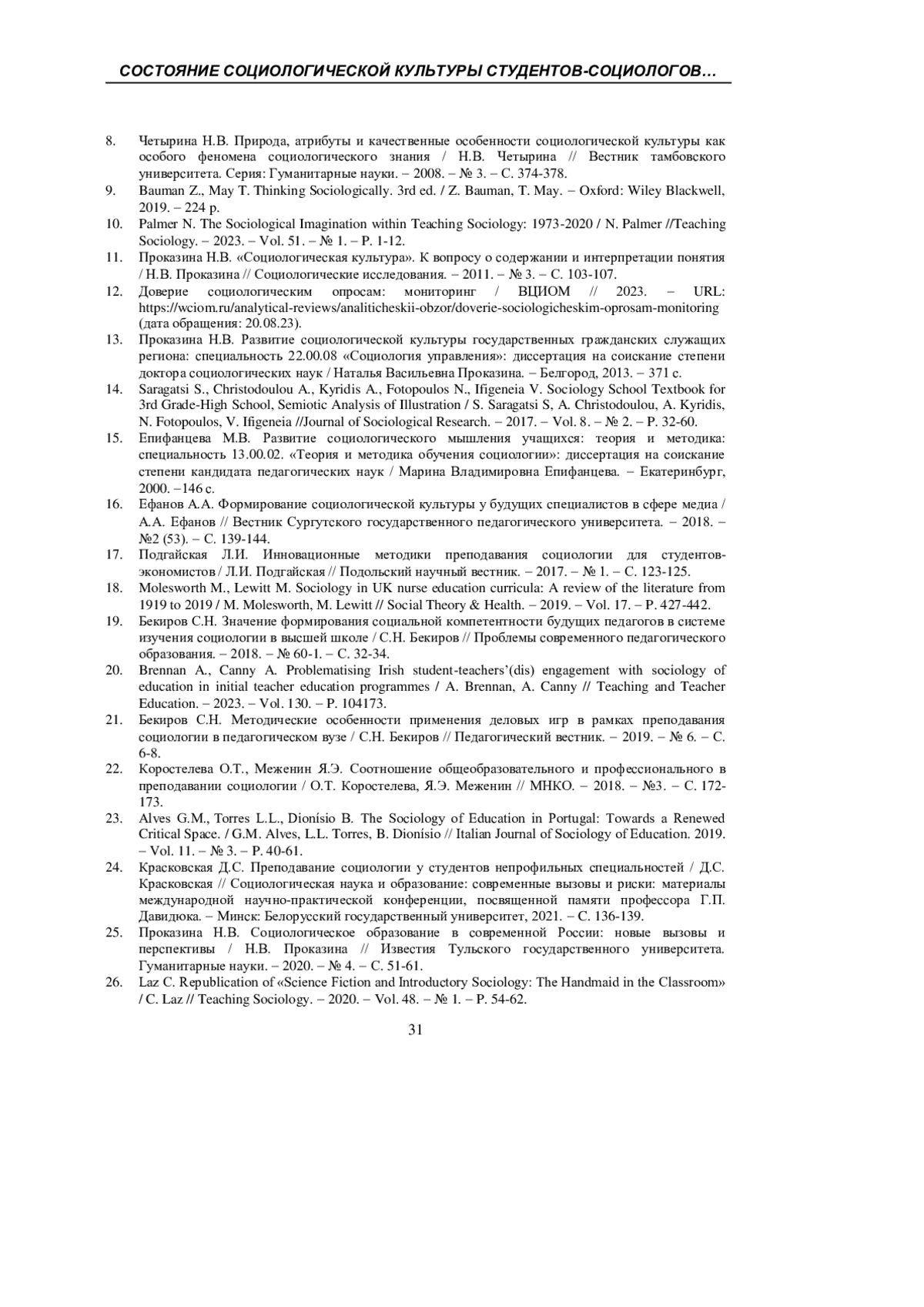 25. Проказина Н.В. Социологическое образование в современной России: новые вызовы и перспективы / Н.В. Проказина // Известия Тульского государственного университета. Гуманитарные науки. - 2020. - № 4. - С. 51-61. EDN: LZZDQB